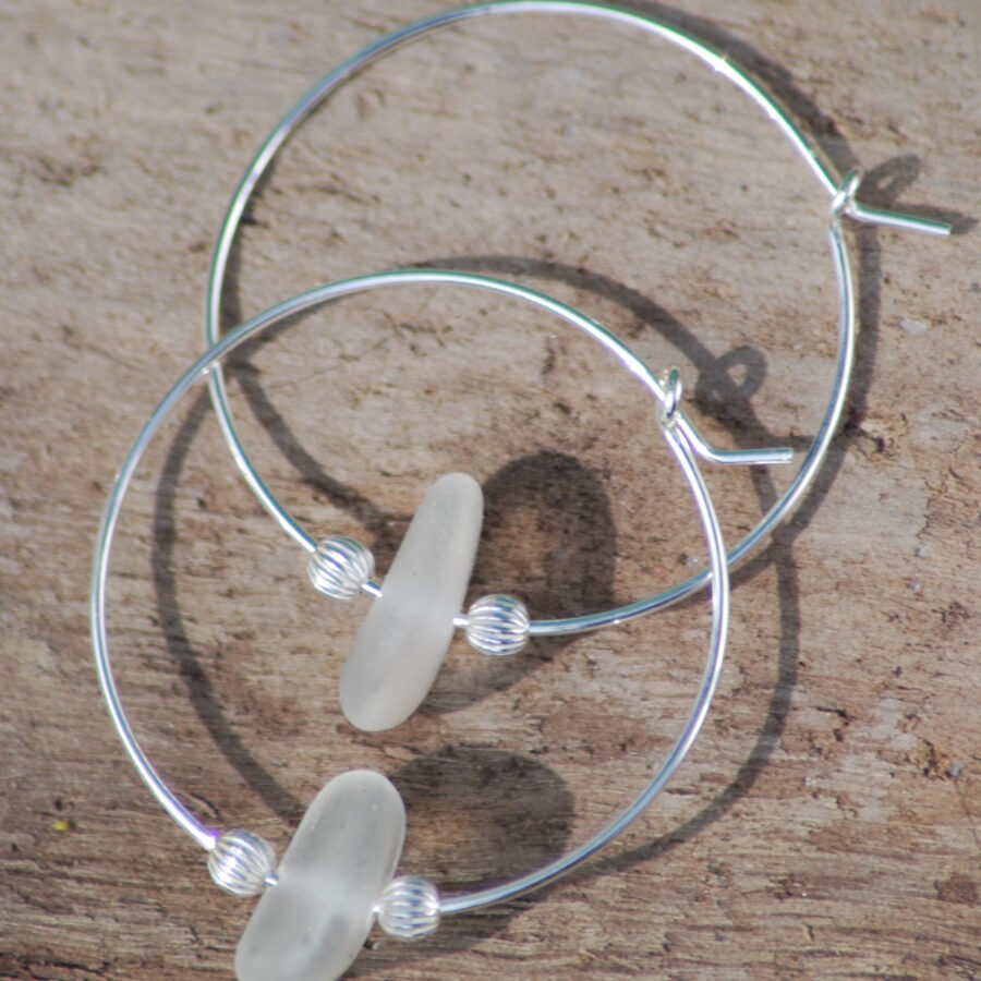 A beautiful pair of hoop earrings featuring genuine locally found sea glass that are similar in colour, size and shape. The artist carefully drills a small hole in the sea glass to thread onto a sterling silver 925 beading hoop. She also adds Miyuki seed beads or sterling silver beads for a little more detail.