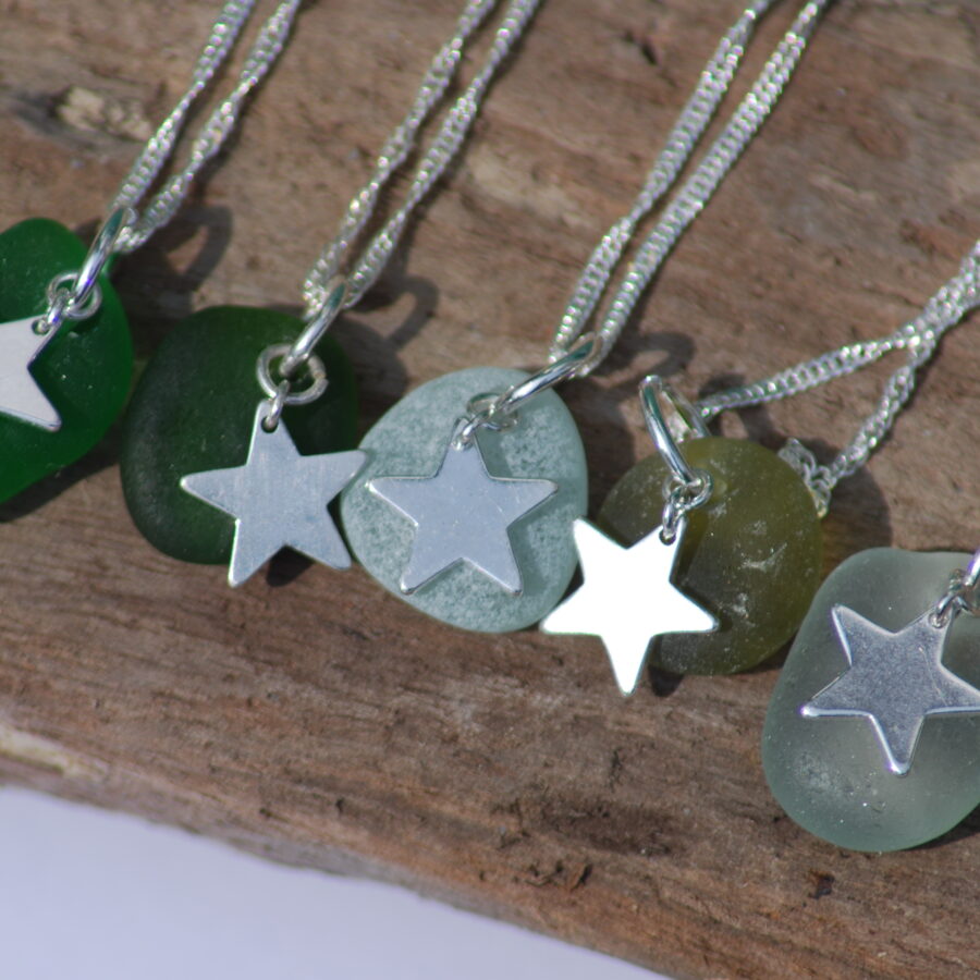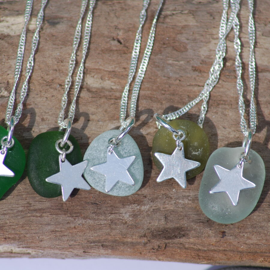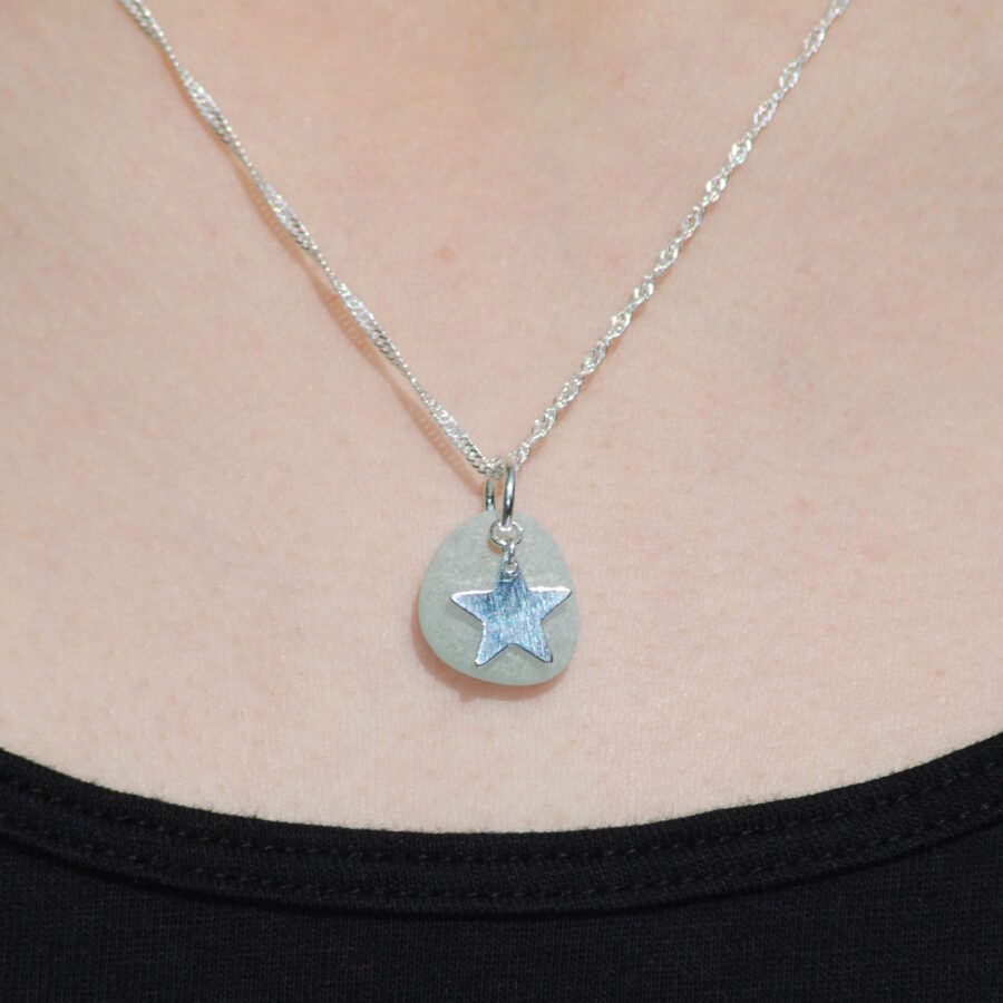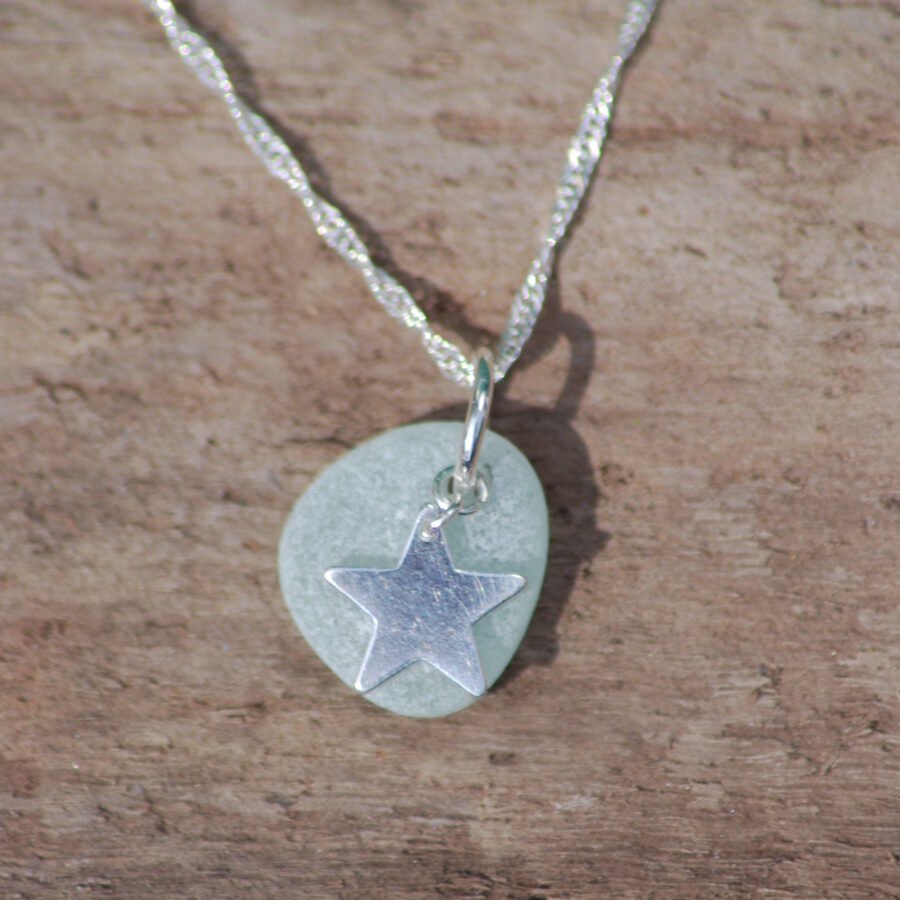 This necklace features a beautiful locally found piece of genuine clear sea glass. The artist has carefully drilled a small hole in the sea glass to attach to a sterling silver jump ring before adding a beautiful sterling silver star charm. Each pendant is complemented by a delicate sterling silver 1.5mm twisted curb chain.