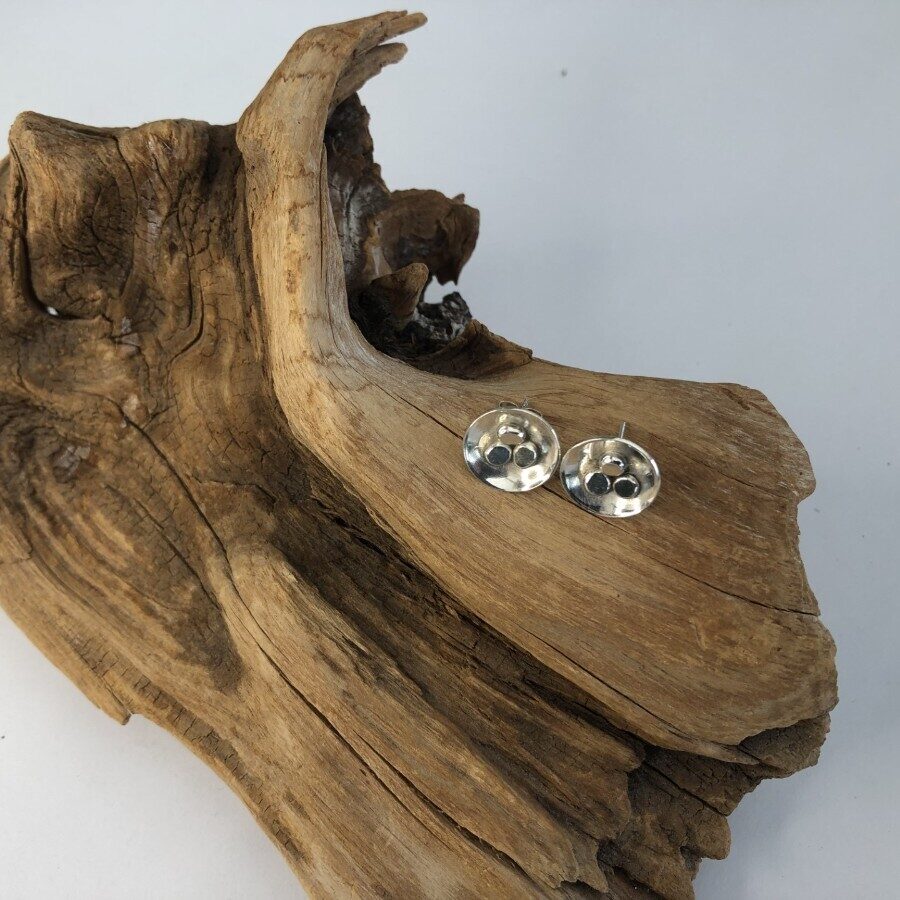 These beautiful earrings are hand made and designed by Lorraine of Twisted Thistles. These sterling silver stud earrings feature a concave disc with pebble detail.