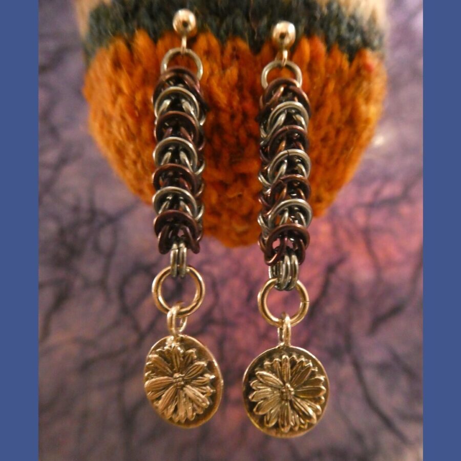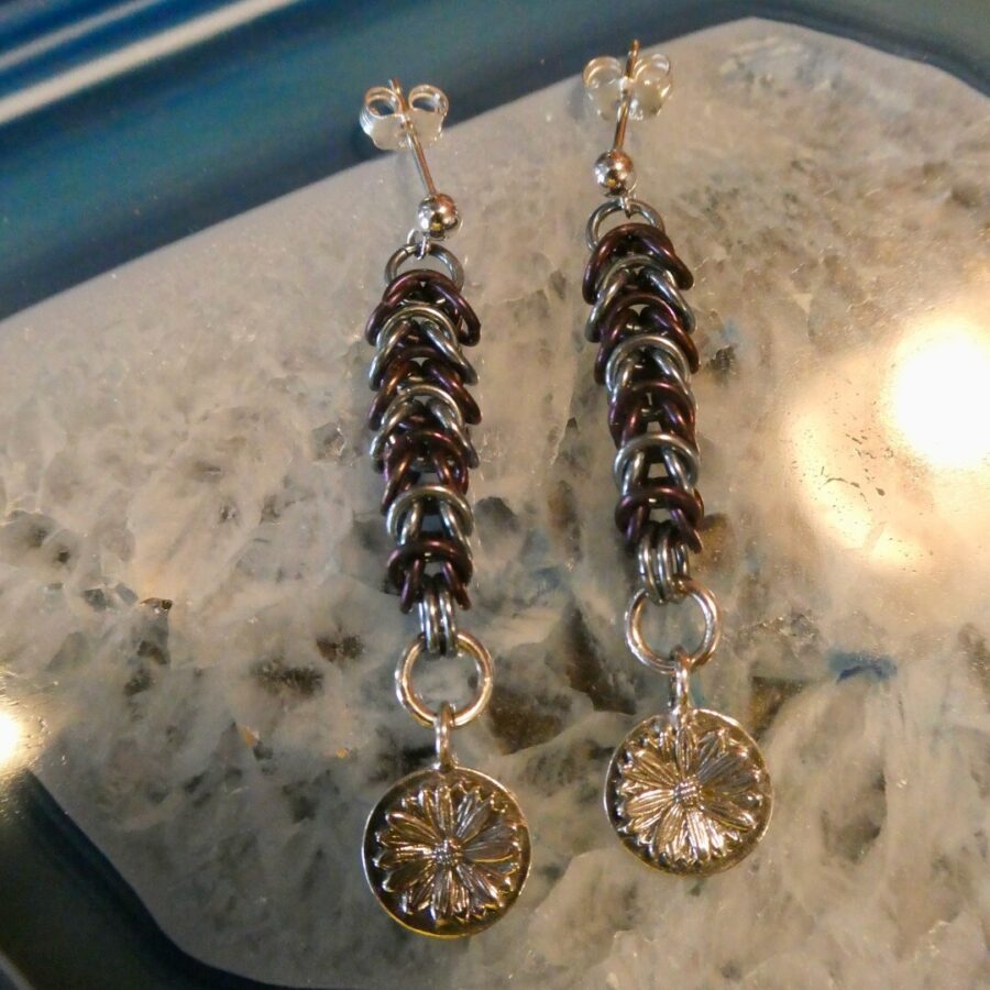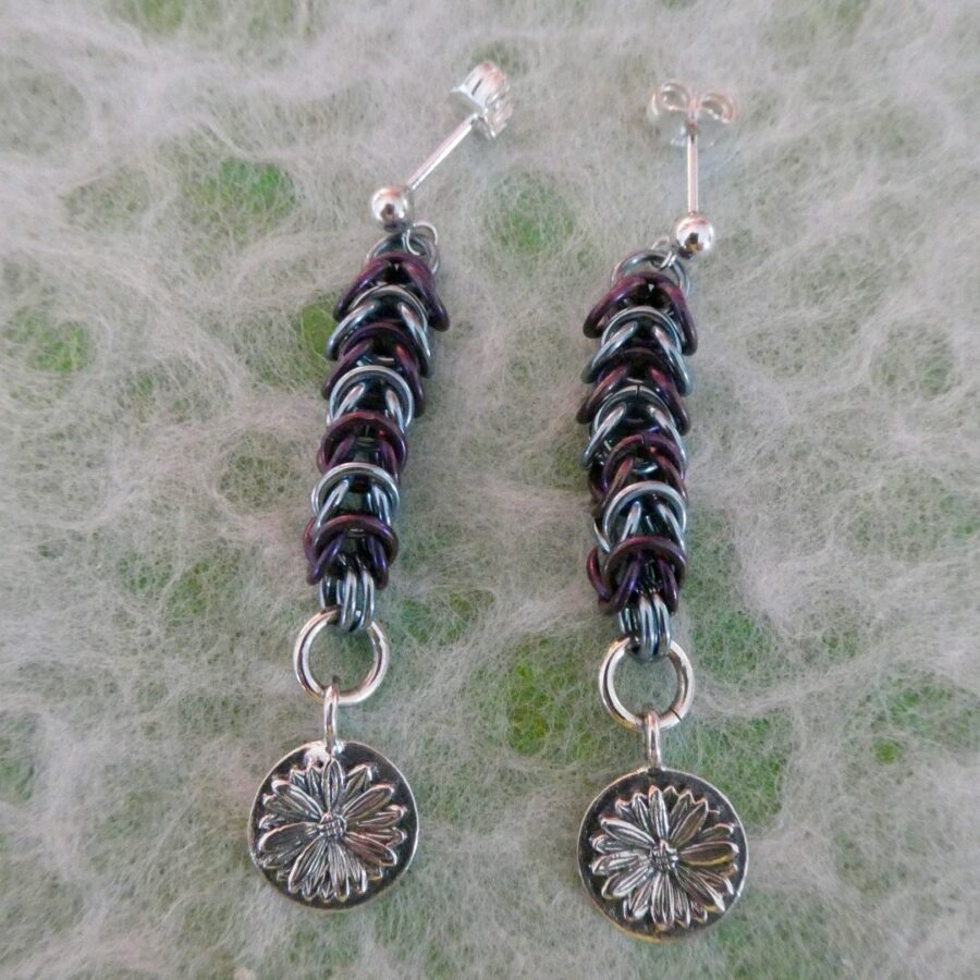 A pair of sterling silver earrings with flower charm, anodised niobium round maille links. Gift box included (sent flat packed and jewellery wrapped in tissue to just pop in).