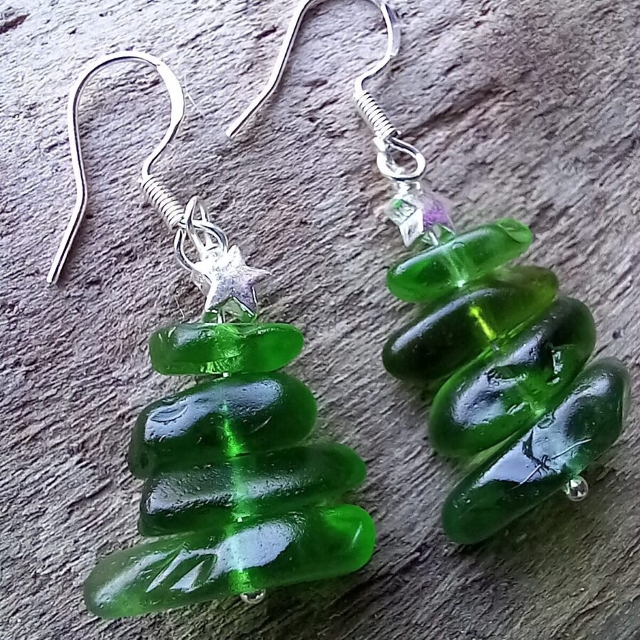A beautiful pair of Christmas tree earrings made with genuine locally found sea glass that are similar in colour, size and shape. Sharon carefully drills a small hole in the sea glass and stacks pieces together to form a Christmas tree shape. She adds the stack to a sterling silver head pin and top with a sterling silver star bead. The Christmas trees hang approx 2cm from the sterling silver hooks.