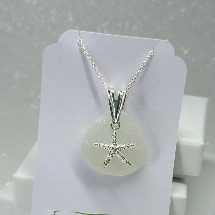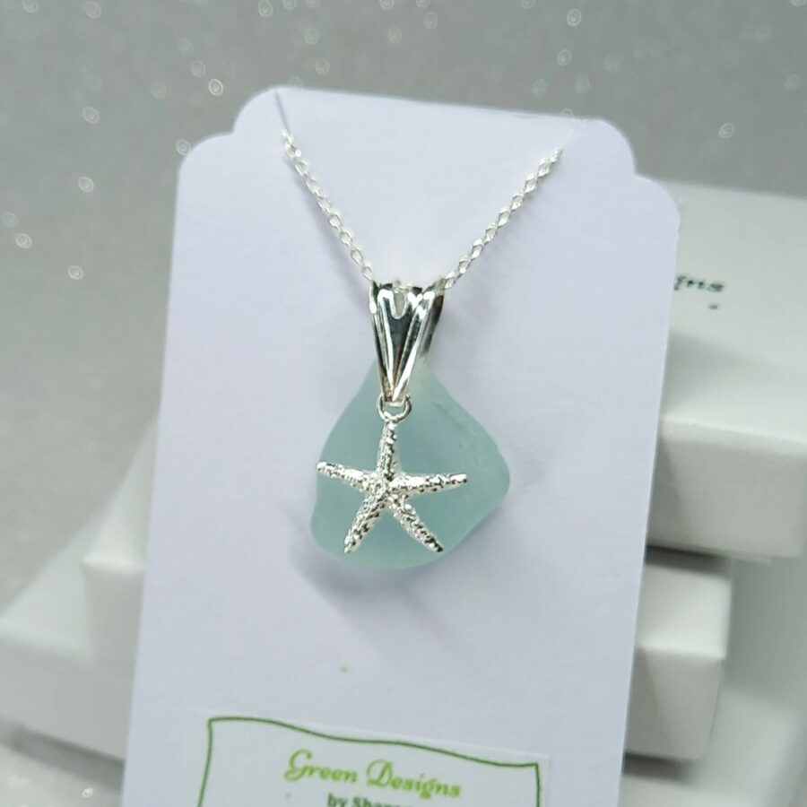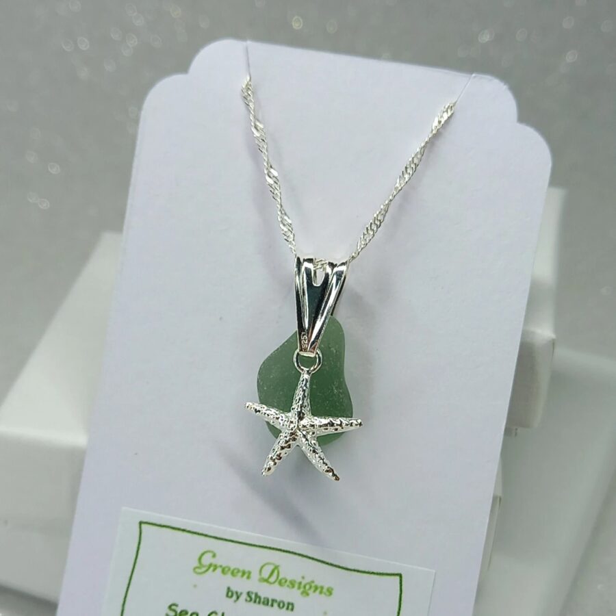 This necklace features a beautiful locally found piece of genuine sea glass in a choice of green, sea foam and clear. The artist has carefully drilled a small hole in the sea glass to attach to a sterling silver jump ring before adding a beautiful sterling silver starfish charm. Each pendant is complemented by a delicate sterling silver chain.