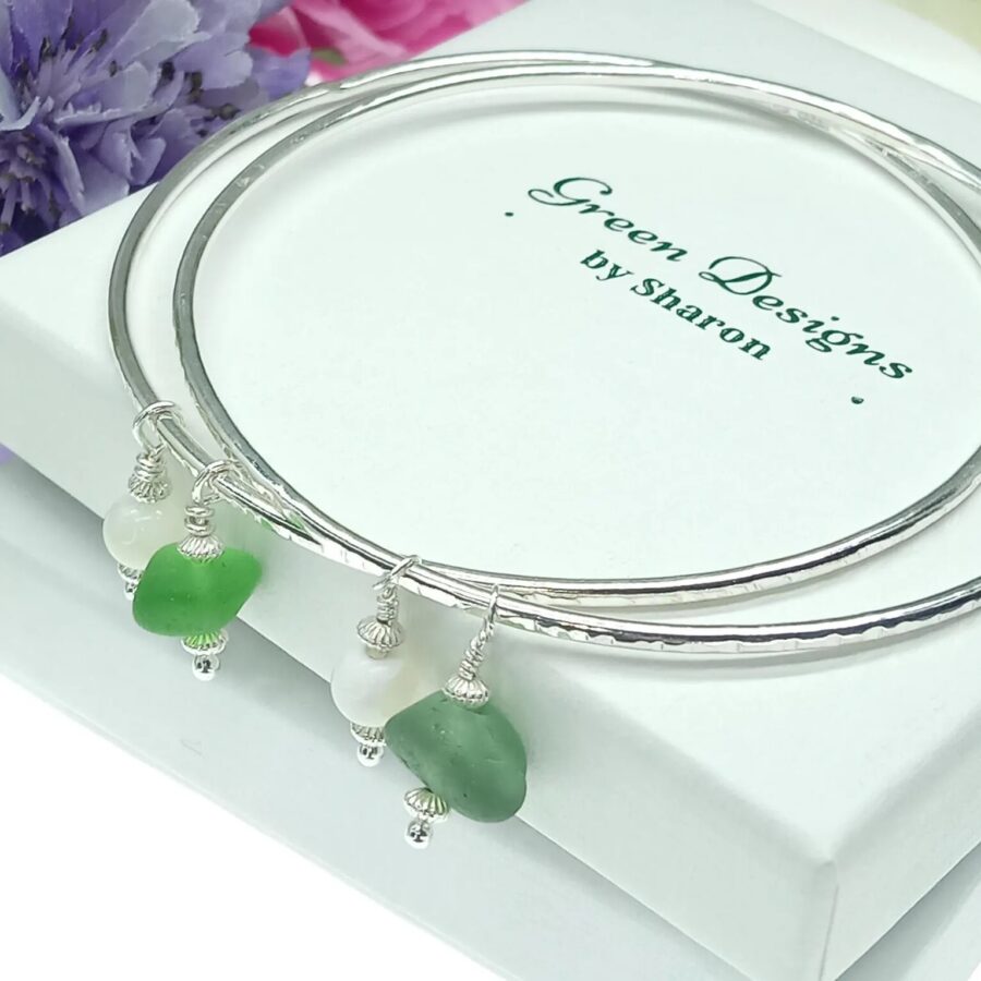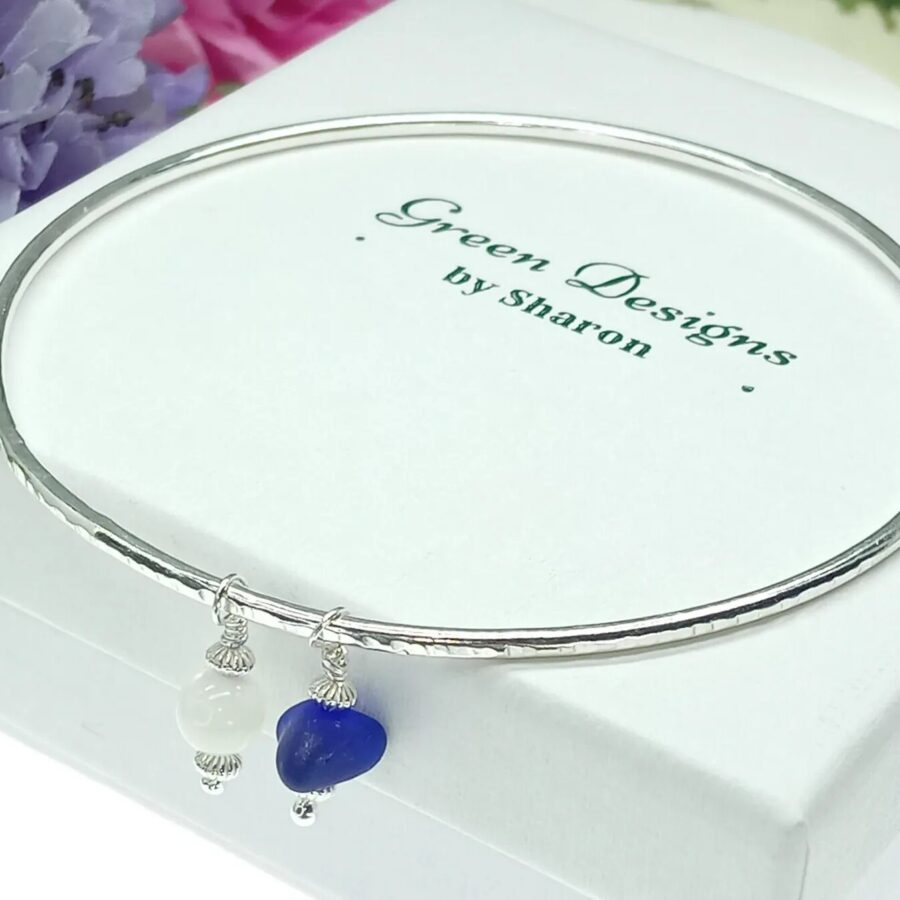 This beautiful hand hammered sterling silver bangle is paired with a beautiful locally found piece of sea glass that is drilled to create a bead and mother of pearl bead. Made using 2 mm recycled sterling silver wire and your bangle has a diameter of approx 7cm. Your bangle is complimented by a beautiful gift box and has been hallmarked at the Edinburgh Assay office including the makers mark of GDS.