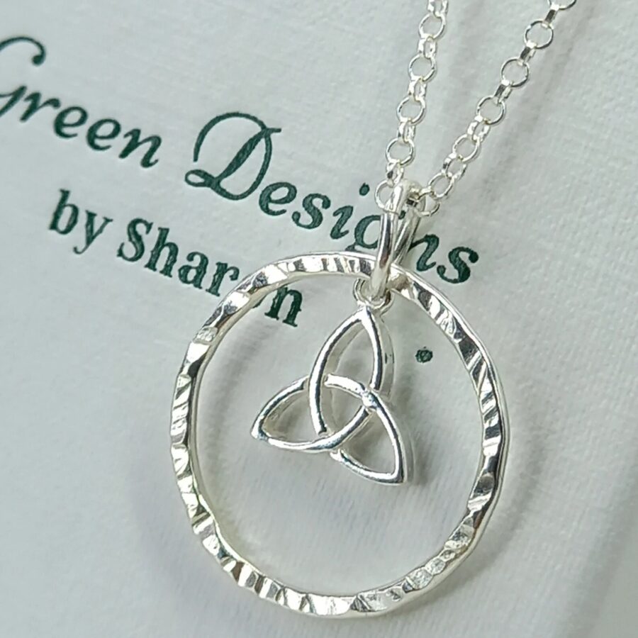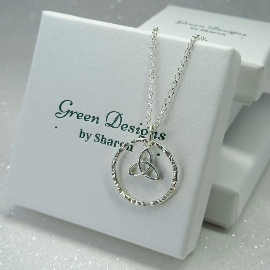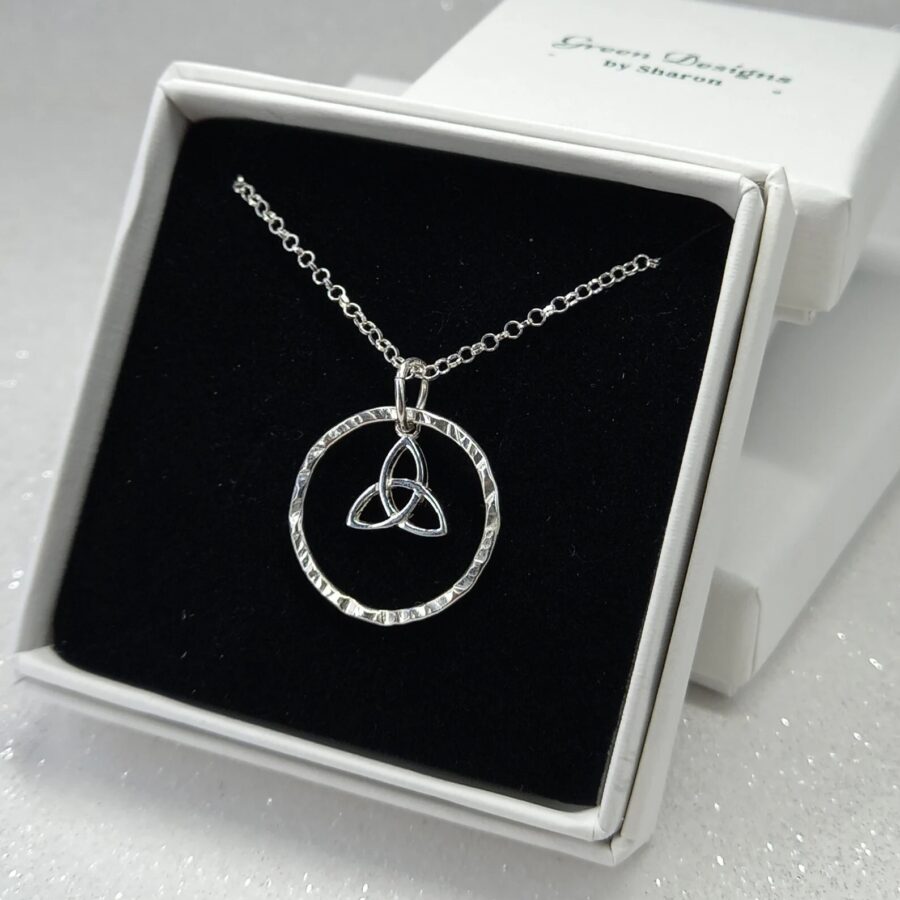 A beautiful sterling silver Celtic knot charm that hangs beautifully inside a handmade textured sterling silver hoop measuring between 2 - 2.5 cm. The hoop moves freely inside the jump ring so is great to fiddle with. This makes this the perfect fidget/worry necklace for anyone that loves Scotland.