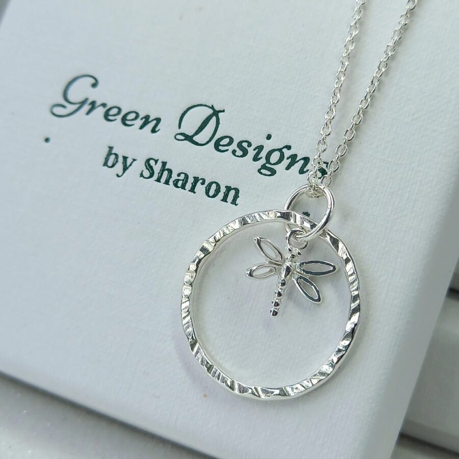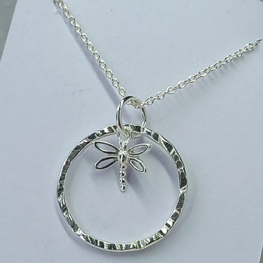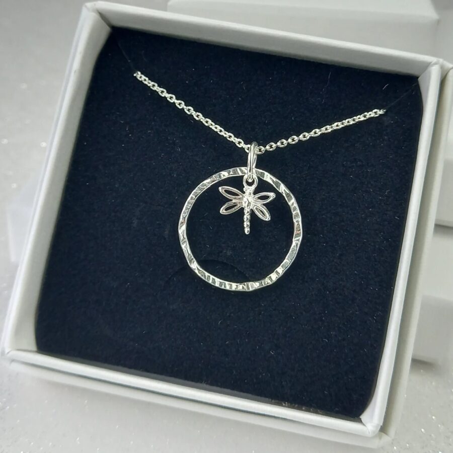 A beautiful sterling silver dragonfly charm that hangs beautifully inside a handmade textured sterling silver hoop measuring between 2 - 2.5 cm. The hoop moves freely inside the jump ring so is great to fiddle with. This makes this the perfect fidget/worry necklace for anyone that loves insects.