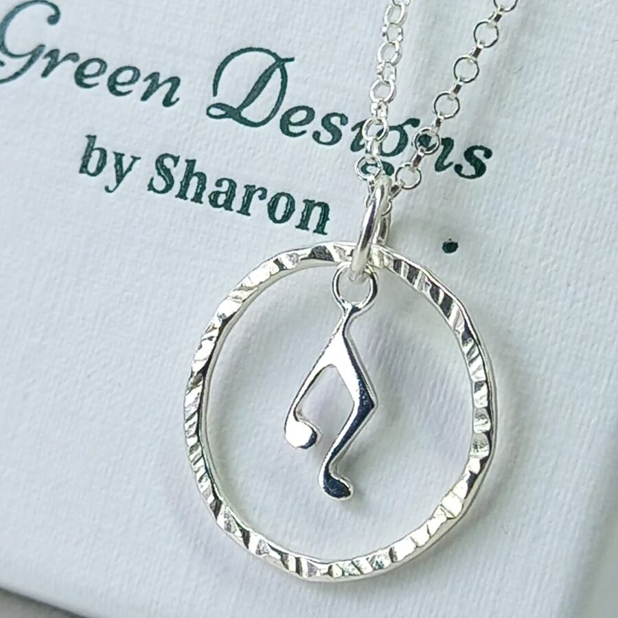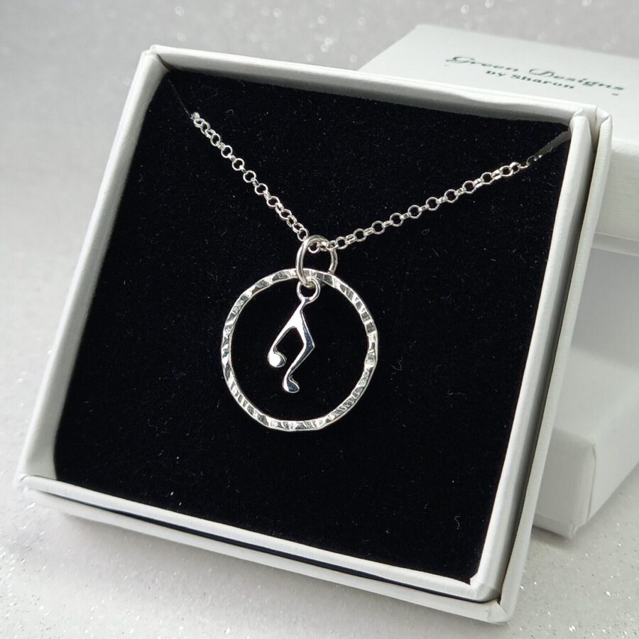 A beautiful sterling silver music note charm that hangs beautifully inside a handmade textured sterling silver hoop measuring between 2 - 2.5 cm. The hoop moves freely inside the jump ring so is great to fiddle with. This makes this the perfect fidget/worry necklace for anyone that loves music.