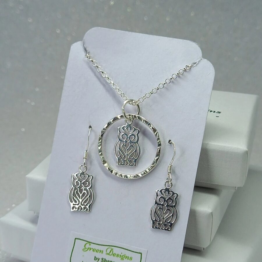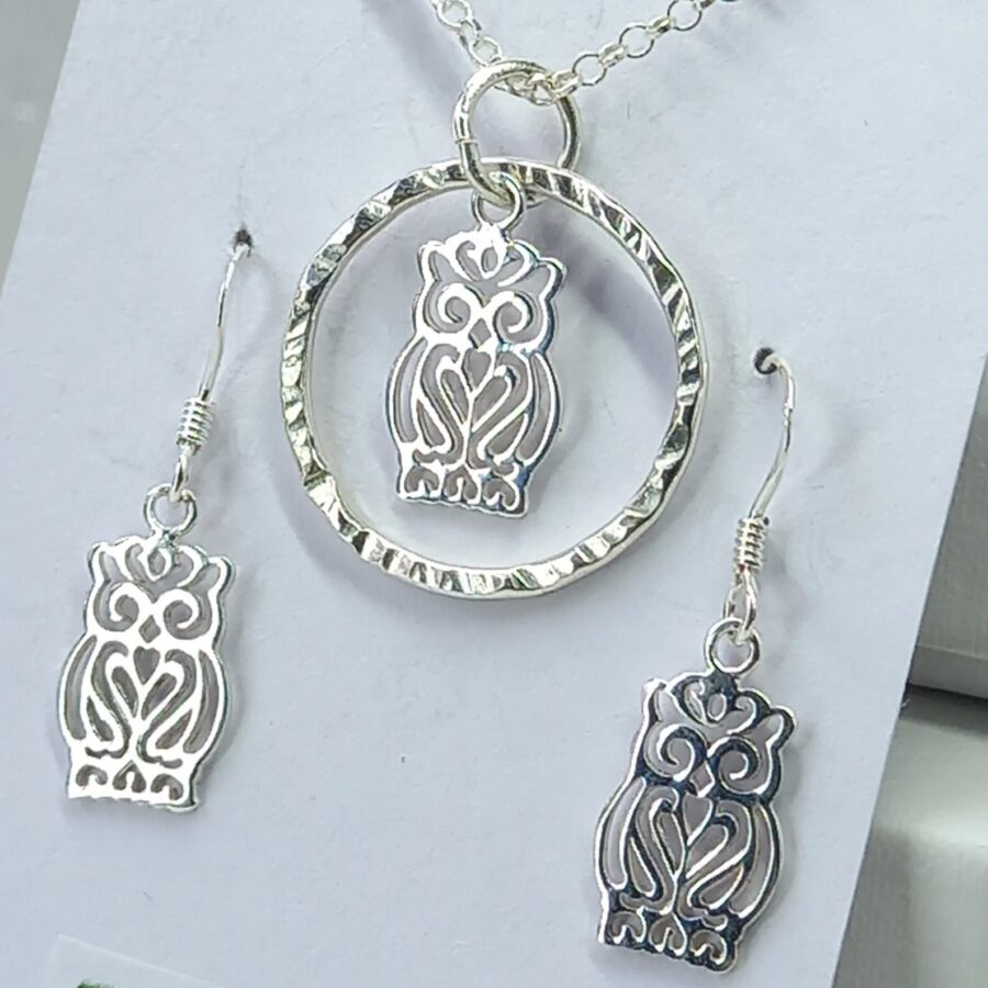 A beautiful sterling silver owl charm that hangs beautifully inside a handmade textured sterling silver hoop measuring between 2 - 2.5 cm. The hoop moves freely inside the jump ring so is great to fiddle with. This makes this the perfect fidget/worry necklace for animal and bird lovers. Comes with matching earrings to make a charming set.