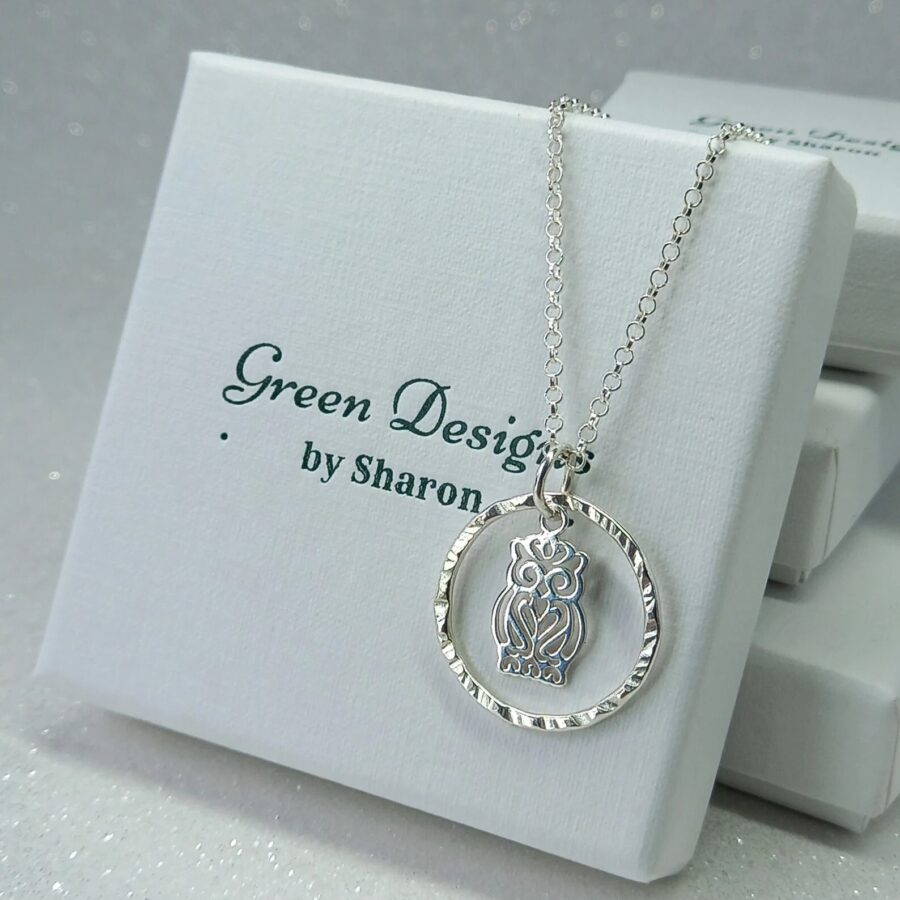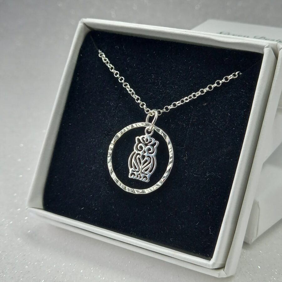 A beautiful sterling silver owl charm that hangs beautifully inside a handmade textured sterling silver hoop measuring between 2 - 2.5 cm. The hoop moves freely inside the jump ring so is great to fiddle with. This makes this the perfect fidget/worry necklace for lovers of animals and birds.