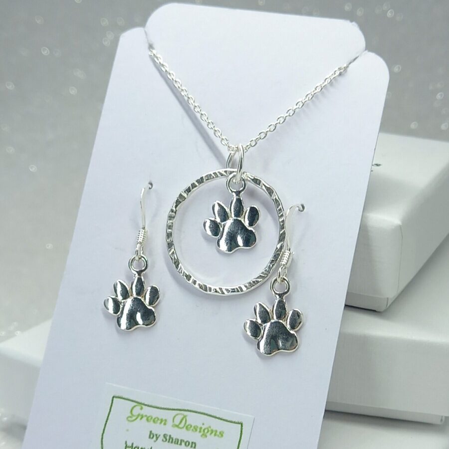 A beautiful sterling silver paw print charm that hangs beautifully inside a handmade textured sterling silver hoop measuring between 2 - 2.5 cm. The hoop moves freely inside the jump ring so is great to fiddle with. This makes this the perfect fidget/worry necklace for anyone that loves animals. Comes with matching earrings to make a charming set.