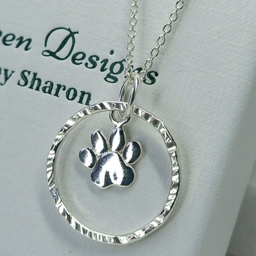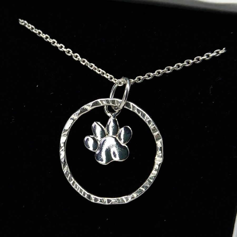 A beautiful sterling silver paw print charm that hangs beautifully inside a handmade textured sterling silver hoop measuring between 2 - 2.5 cm. The hoop moves freely inside the jump ring so is great to fiddle with. This makes this the perfect fidget/worry necklace for anyone that loves animals.