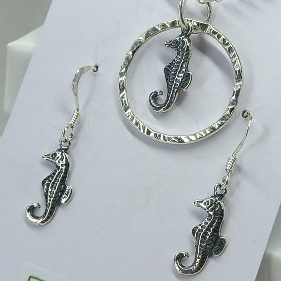 A beautiful sterling silver seahorse charm that hangs beautifully inside a handmade textured sterling silver hoop measuring between 2 - 2.5 cm. The hoop moves freely inside the jump ring so is great to fiddle with. This makes this the perfect fidget/worry necklace for anyone who loves seahorses. Comes with matching earrings to make a charming set.