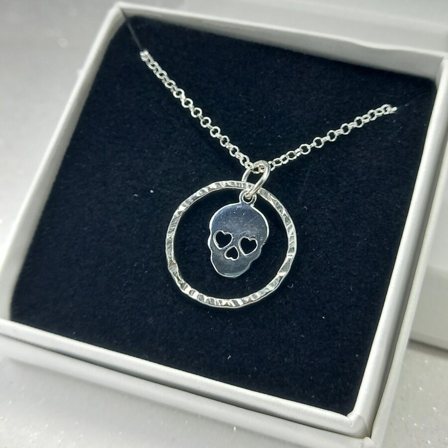 A beautiful sterling silver skull charm that hangs beautifully inside a handmade textured sterling silver hoop measuring between 2 - 2.5 cm. The hoop moves freely inside the jump ring so is great to fiddle with. This makes this the perfect fidget/worry necklace for anyone that loves skulls.