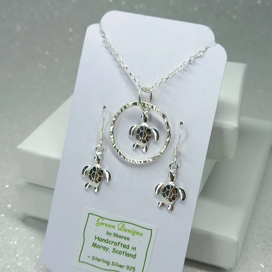 Sterling Silver Hammered Hoop with Turtle Charm Jewellery Set