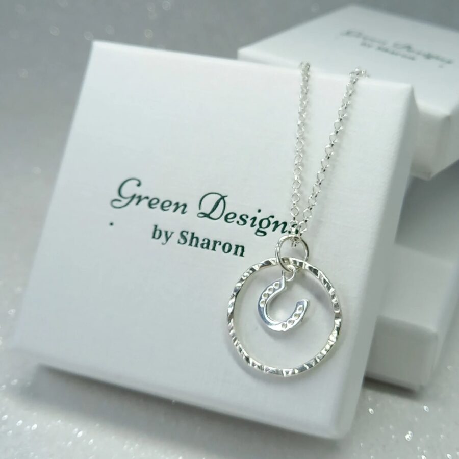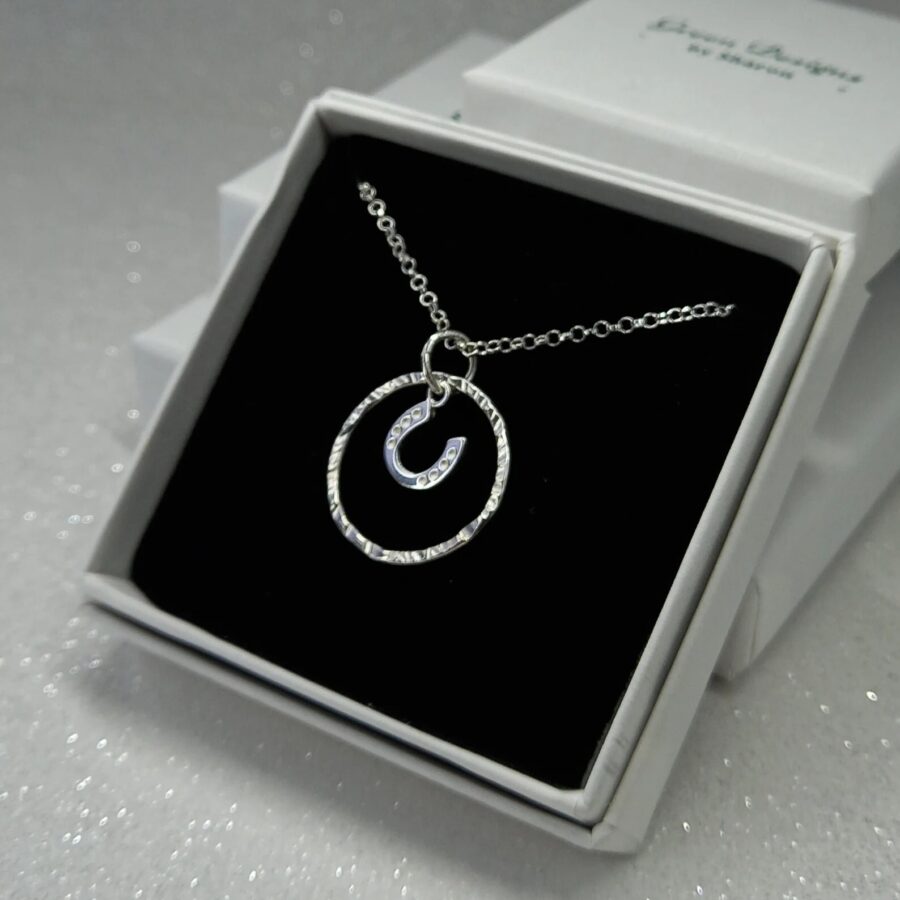 A beautiful sterling silver horseshoe charm that hangs beautifully inside a handmade textured sterling silver hoop measuring between 2 - 2.5 cm. The hoop moves freely inside the jump ring so is great to fiddle with. This makes this the perfect fidget/worry necklace for lovers of horses or for good luck.