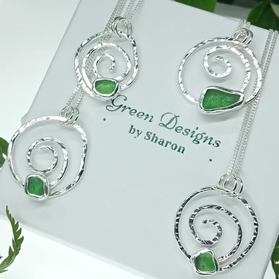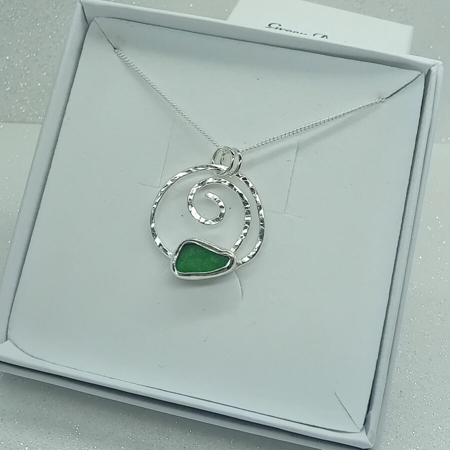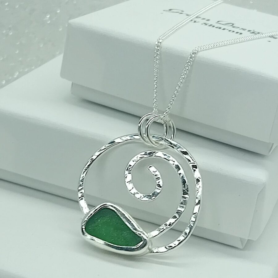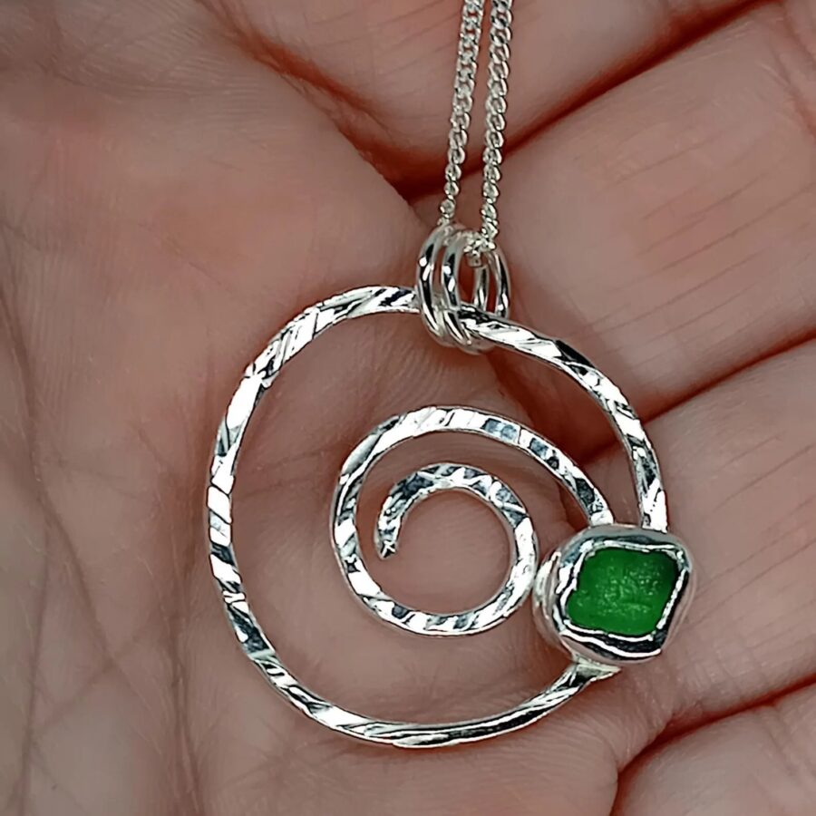This beautiful necklace is made using 1.5 mm recycled sterling silver wire to create an interesting hammered textured swirl. The maker has added a beautiful piece of Scottish sea glass inside an individually crafted sterling silver bezel. Your pendant will measure approx 2.5 - 3 cm. Each piece is textured and shaped by hand.