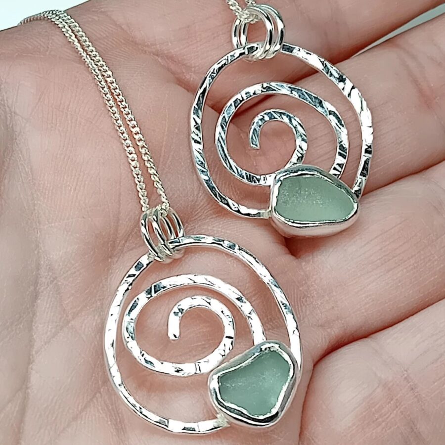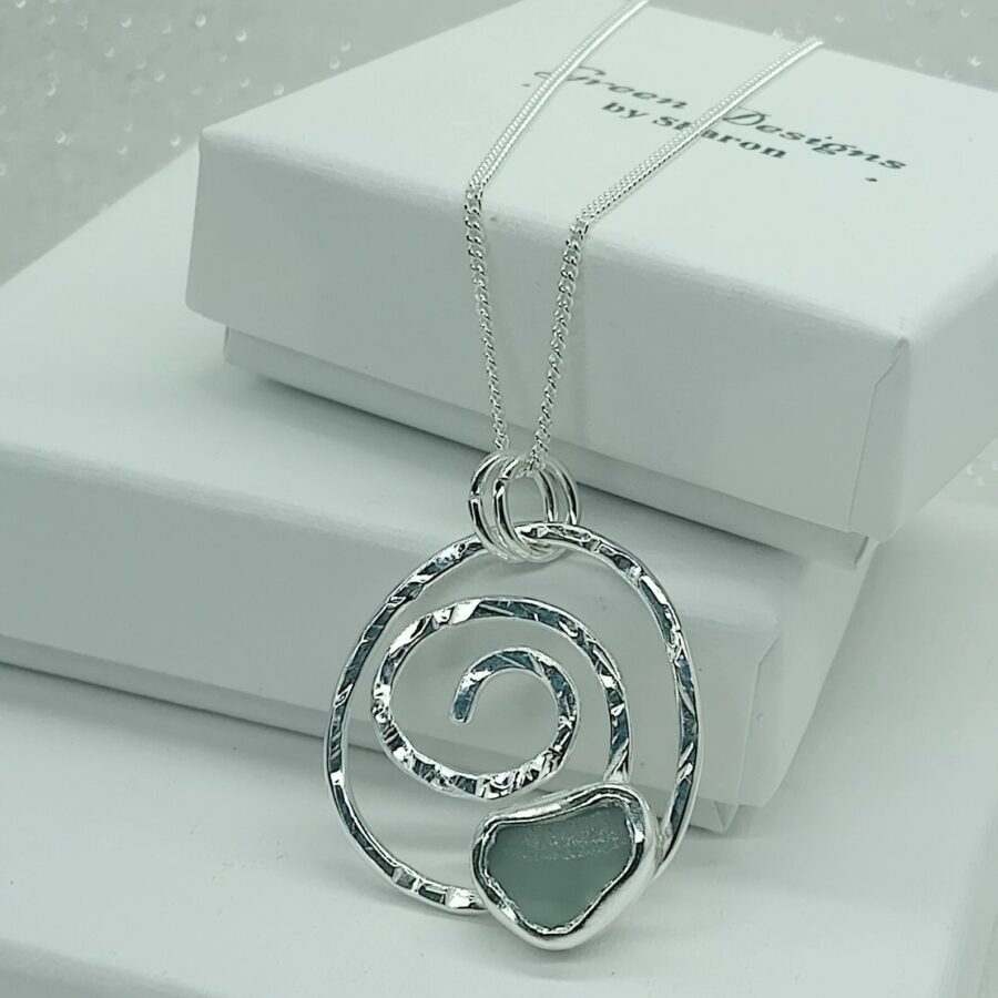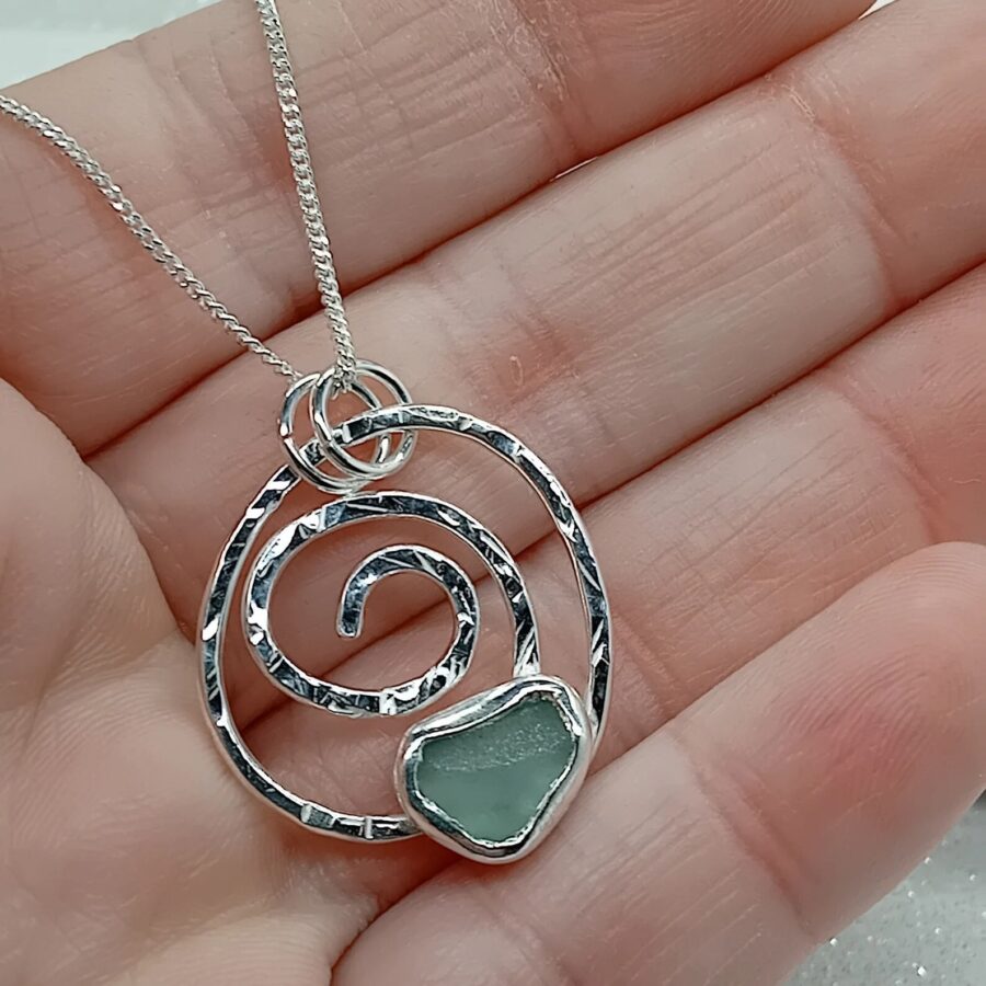This beautiful necklace is made using 1.5 mm recycled sterling silver wire to create an interesting hammered textured swirl. The maker has added a beautiful piece of Scottish sea glass inside an individually crafted sterling silver bezel. Your pendant will measure approx 2.5 - 3 cm. Each piece is textured and shaped by hand.