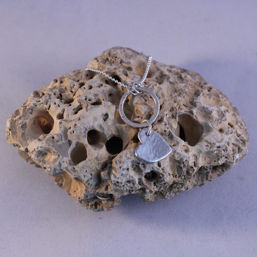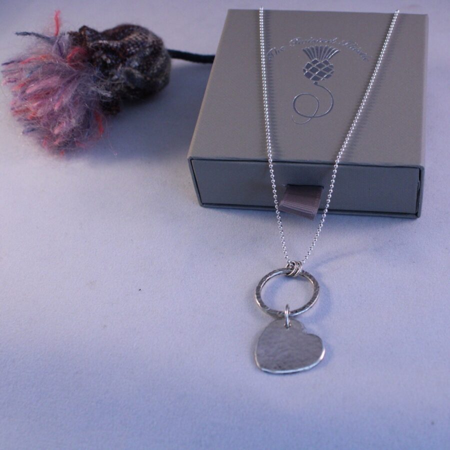 This beautiful necklace is hand made and designed by Lorraine of Twisted Thistles. The piece consists of a 2 cm hammered heart attached to a hammered 2 cm circle by a silver jump ring. There is a double jump ring to attach the chain