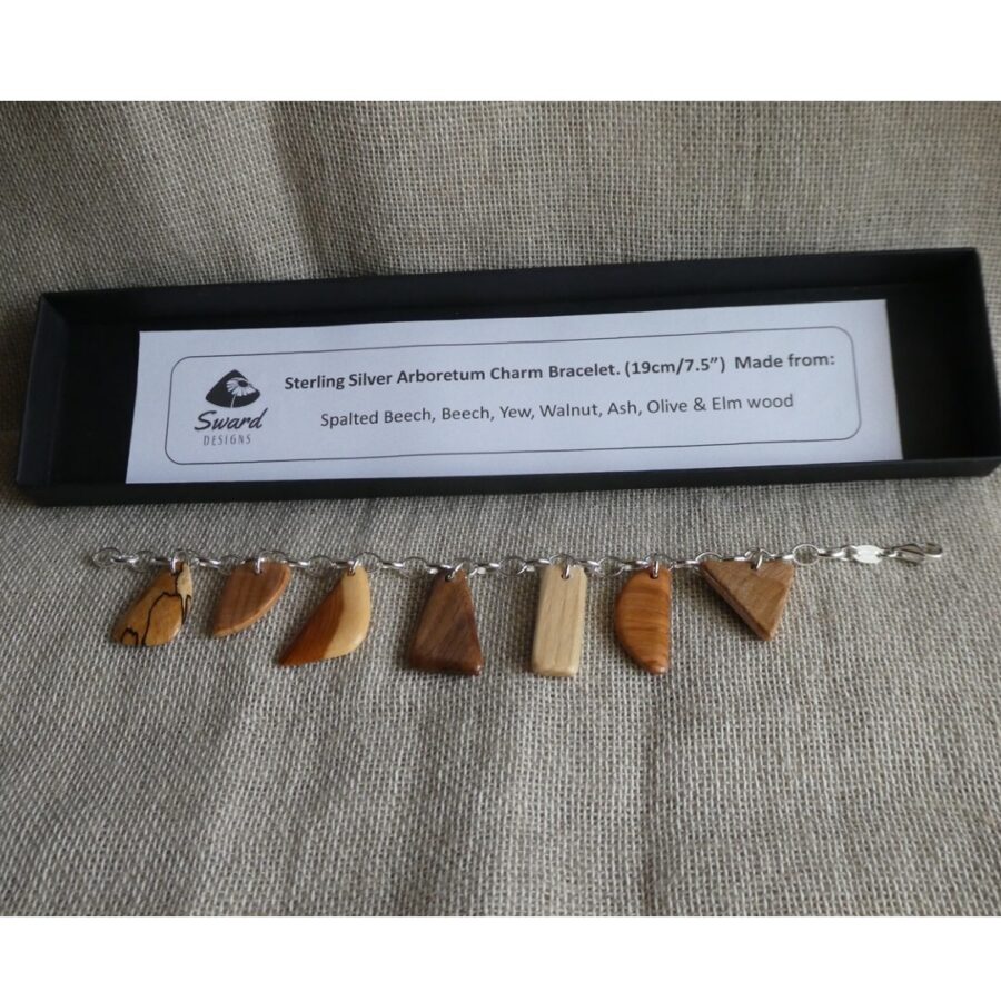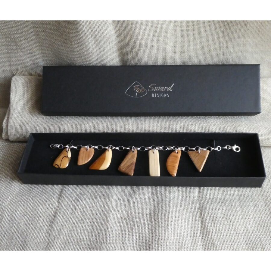 These charm bracelets are made from a selection of different European wood types, on a Sterling Silver chain. Each piece of wood has been individually hand cut, sanded and finished with a clear toy-safe lacquer. This type of finish enhances the fantastic range of colours and patterns found in natural wood without the need for paint or dyes. Every Arboretum bracelet made is slighlty different, and each piece of wood on it has its own individual fingerprint, meaning you will own something truly unique. Bracelets are presented in a black cardboard box, with a label detailing the wood type.