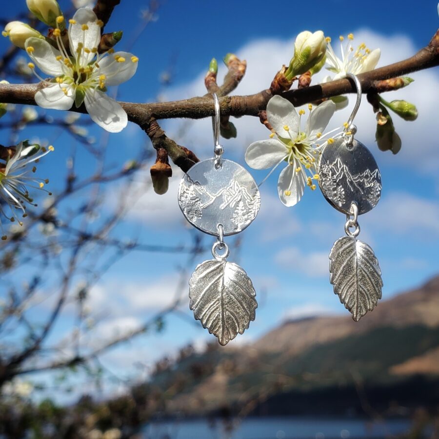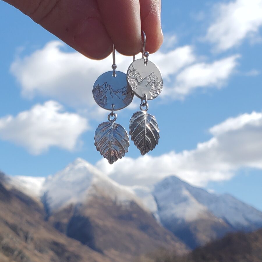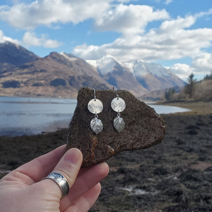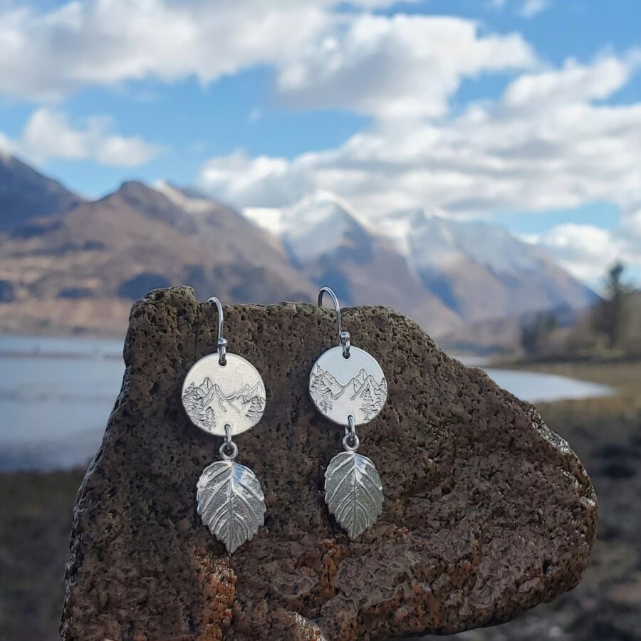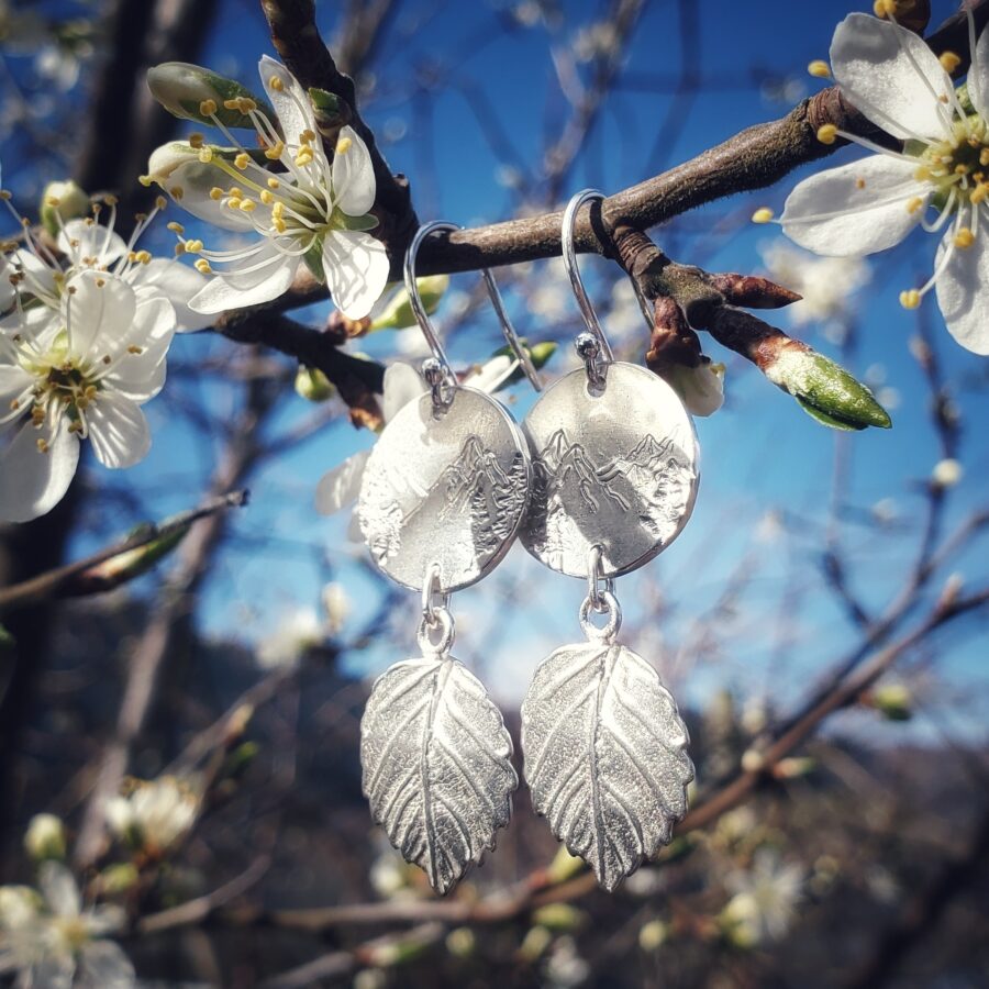 A pair of gorgeous sterling silver disc earrings featuring a mountain scene with leaf suspended below. The disc measures 15 mm across. Total length from the top of wire to tip of the leaf measures 50mm. Sterling silver ear wires. They come gift boxed.