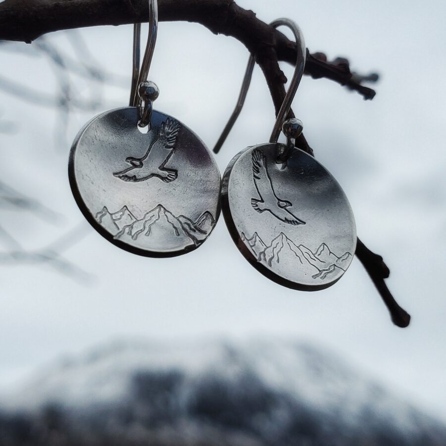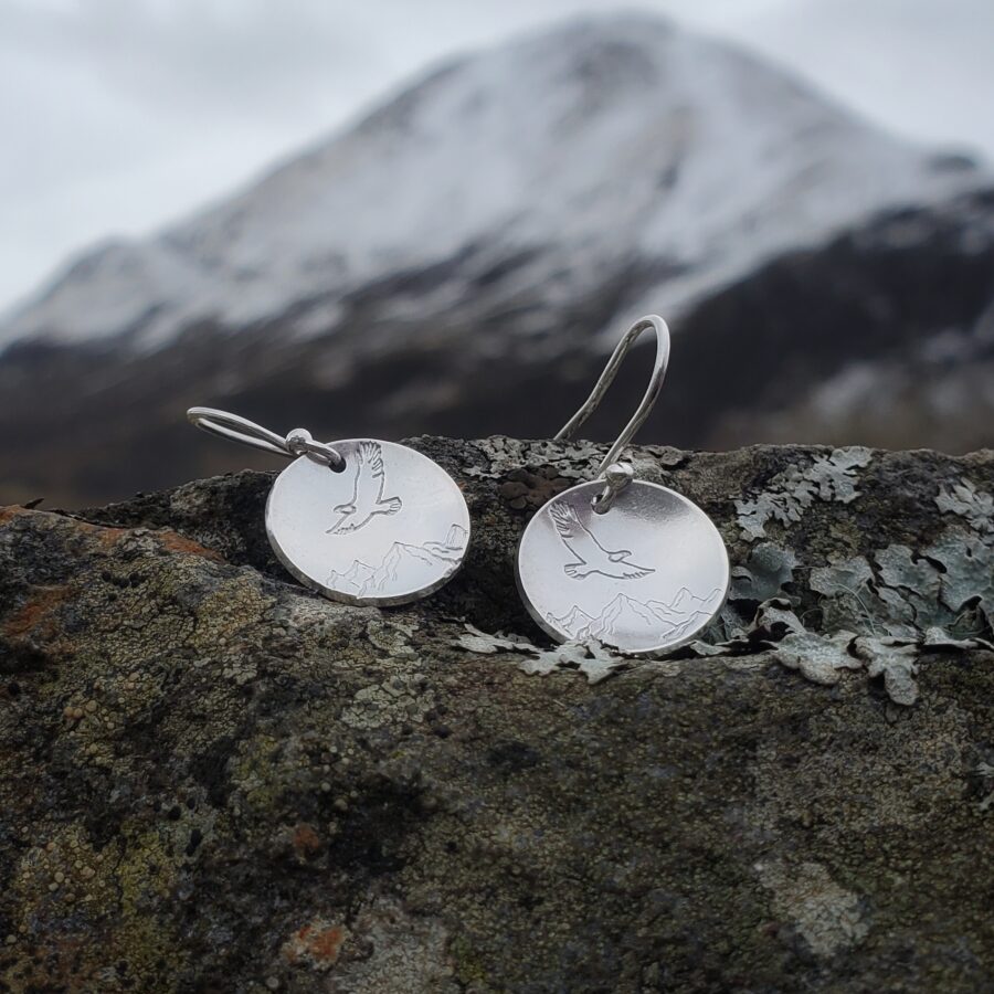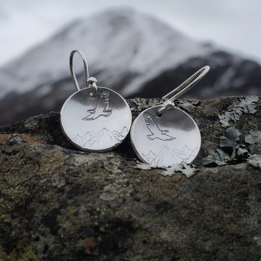 A pair of gorgeous sterling silver disc earrings featuring a mountain scene with eagle flying overhead. The disc measures 15 mm across and hang from sterling silver ear wires. They come gift boxed.