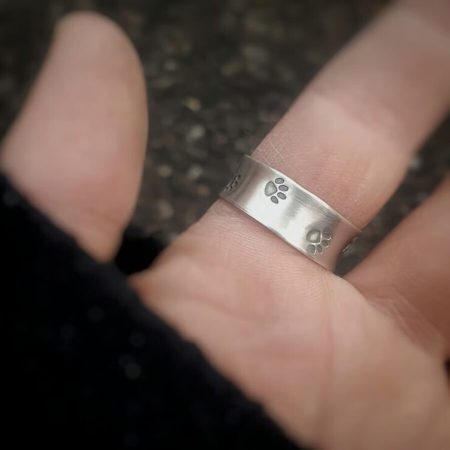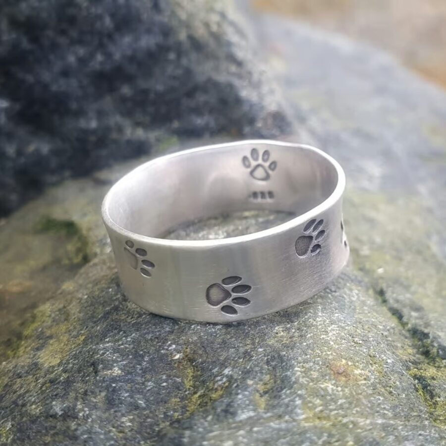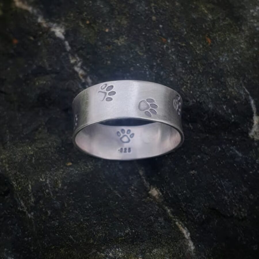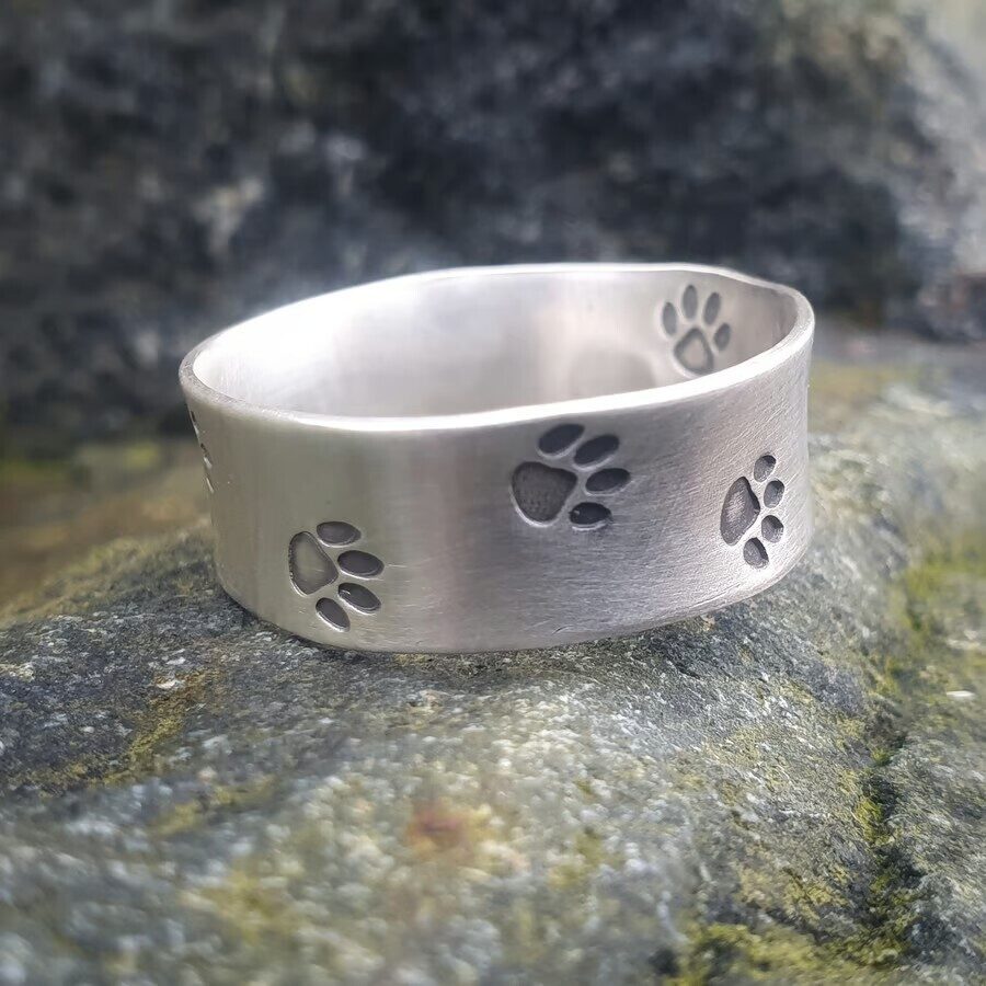 This gorgeous sterling silver paw print ring is made to order in your size. It is an 8mm wide band with tiny paw prints stamped all around. Please allow up to two weeks for it to be made in your size, choose your preferred finish using the drop down menu (shiny or brushed matt silver). If you are unsure of your size you can either buy a reusable ring sizer or use this size chart. Add your size in the comment box when ordering.