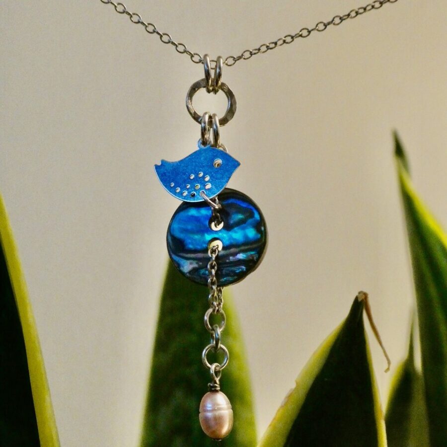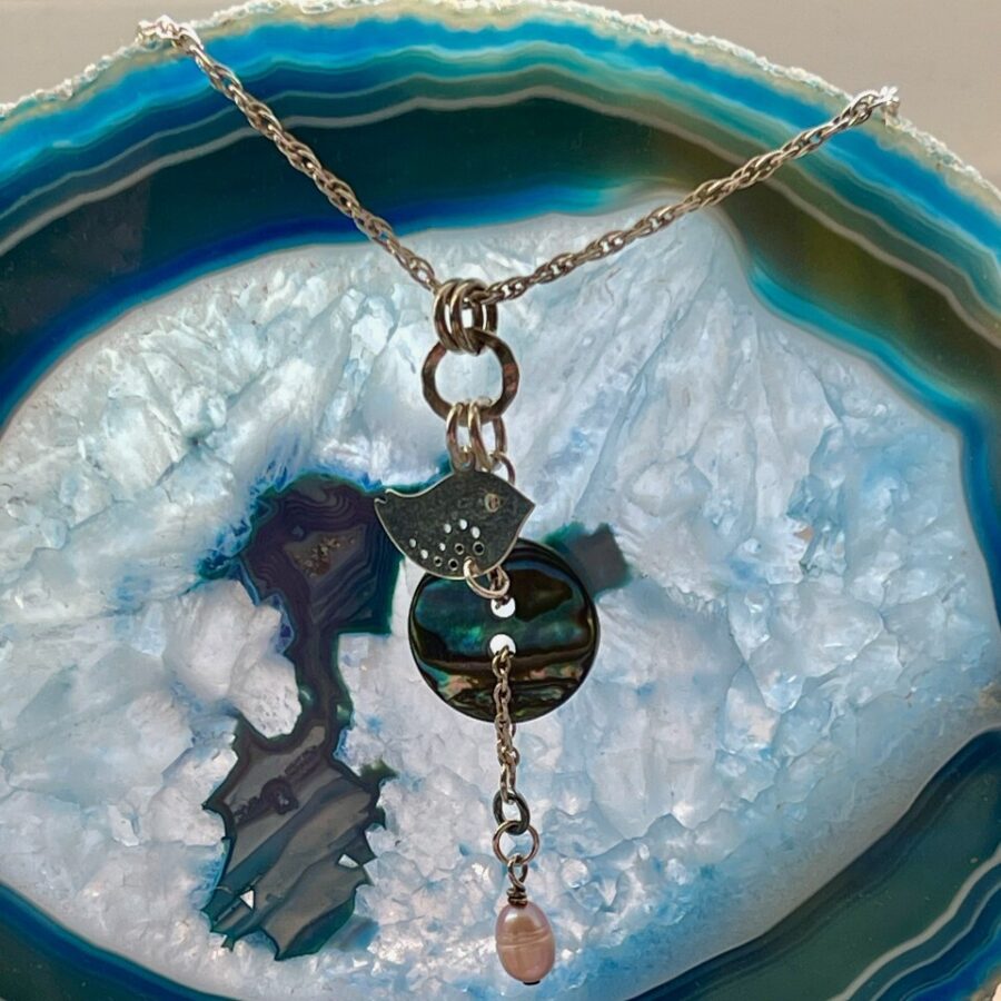 A sterling silver pendant, bird charm with hammered silver links, anodised niobium link, abalone pearl button on 16 “ sterling silver trace chain. Gift box included (sent flat packed and jewellery wrapped in tissue to just pop in).