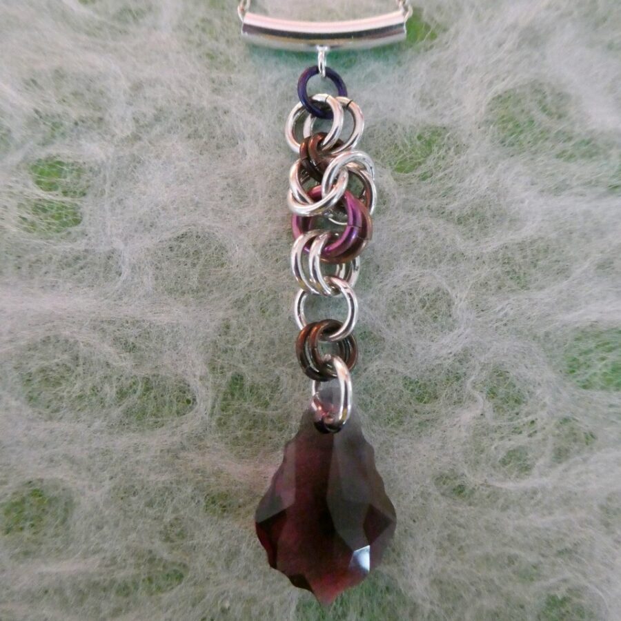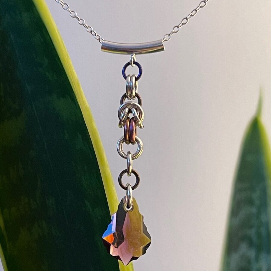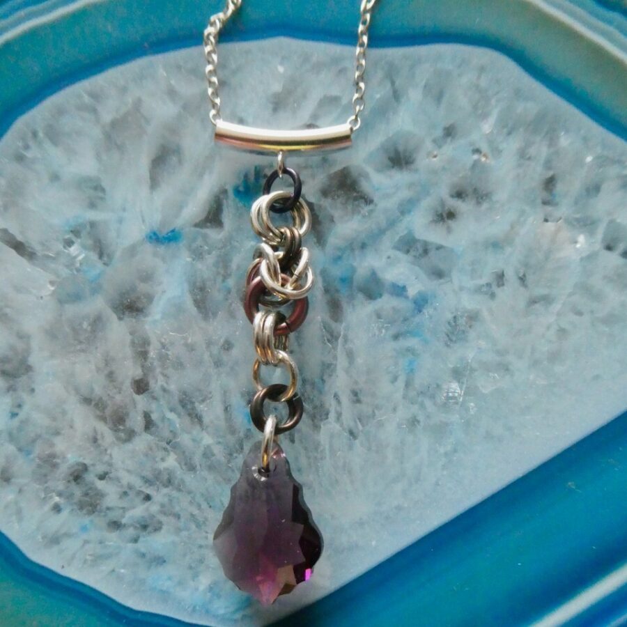 A sterling silver pendant, anodised niobium byzantine links and glass pendant drop on 16” sterling silver trace chain. Gift box included (sent flat packed and jewellery wrapped in tissue to just pop in).