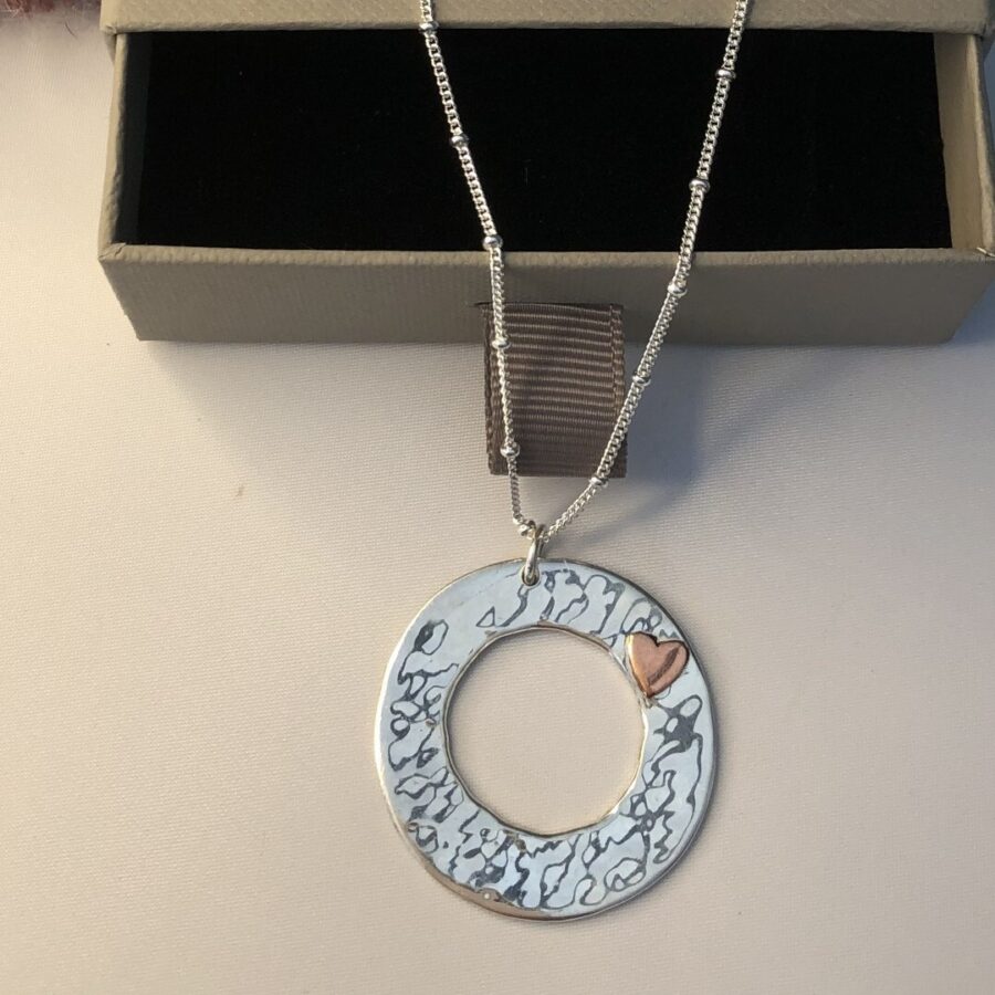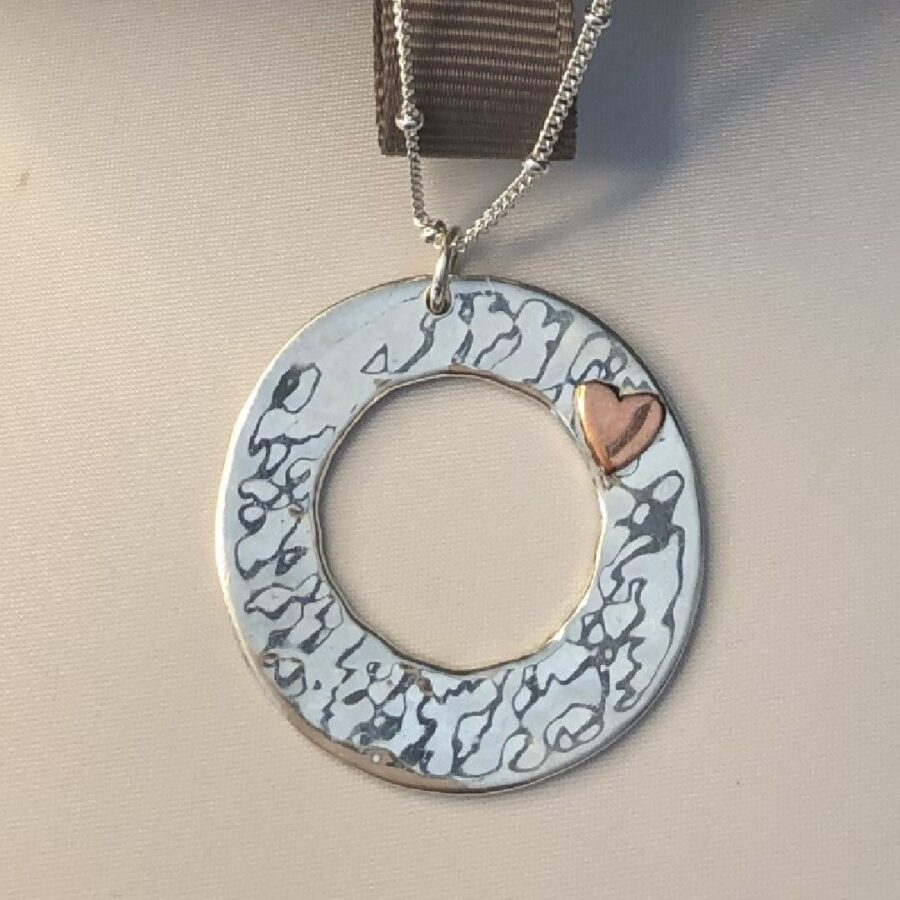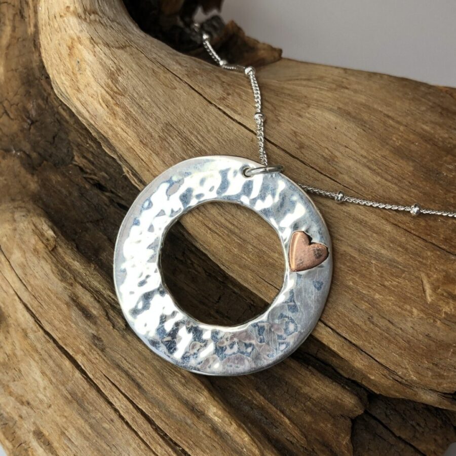 This necklace is hand made and designed by Lorraine of Twisted Thistles. This beautiful necklace features a solid silver ring with a copper heart sitting on it and hangs from a beaded chain.