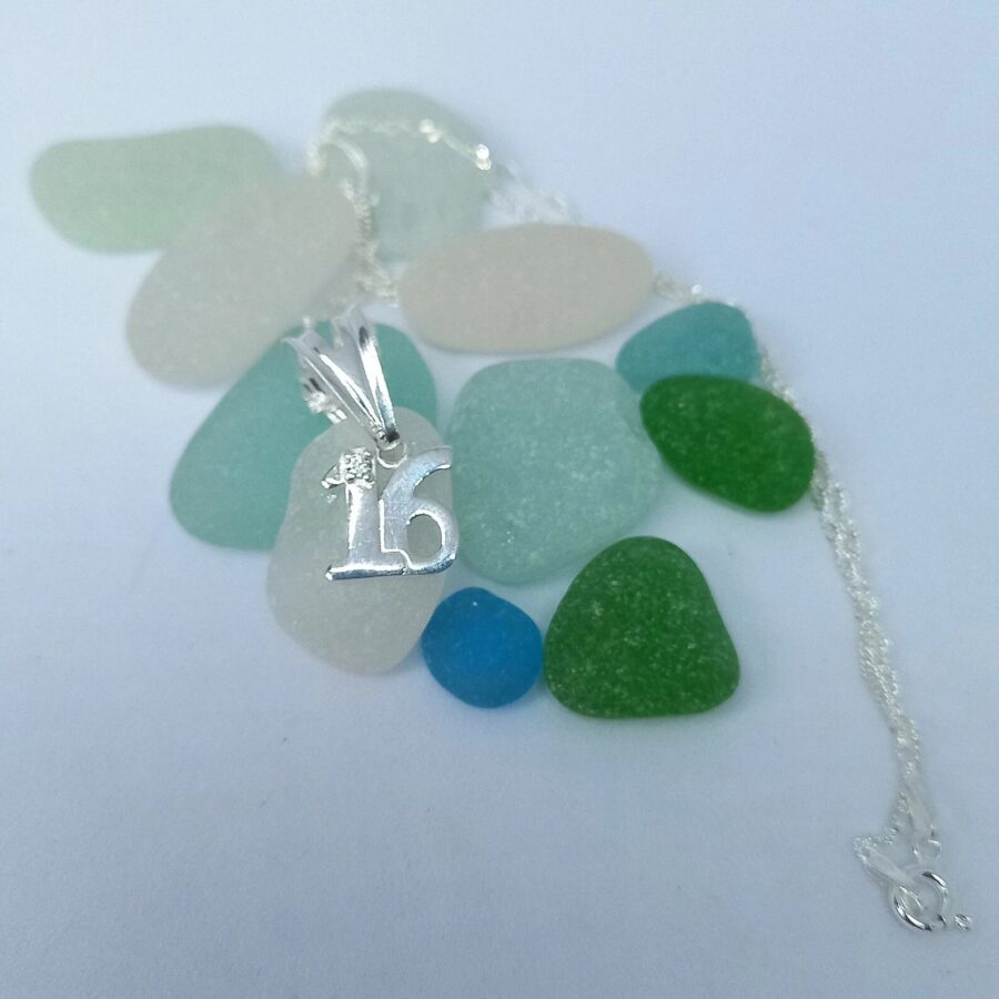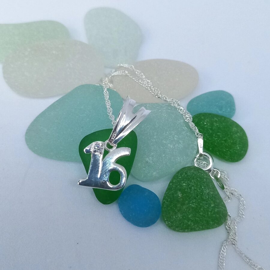 This necklace features a beautiful locally found piece of genuine sea glass in green or clear (select using the drop down menu). The artist has carefully drilled a small hole in the sea glass to attach to a sterling silver jump ring before adding a beautiful sterling silver 16th charm. Each pendant is complemented by a delicate sterling silver 1.5mm twisted curb chain.