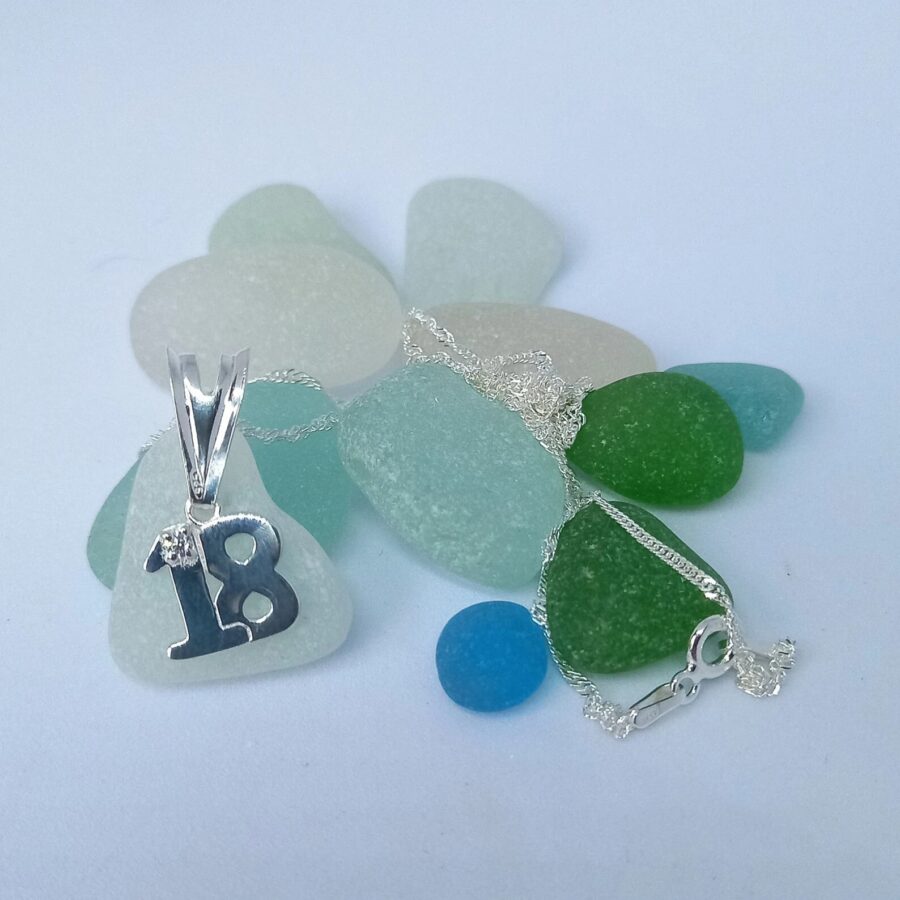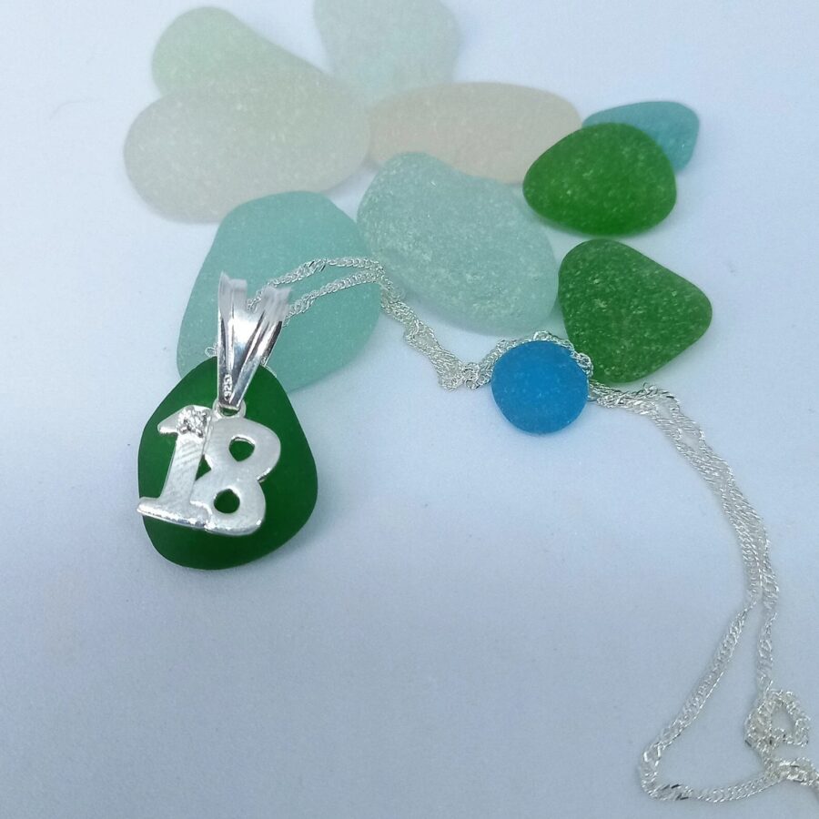 This necklace features a beautiful locally found piece of genuine sea glass in green or clear (select using the drop down menu). The artist has carefully drilled a small hole in the sea glass to attach to a sterling silver jump ring before adding a beautiful sterling silver 18th charm. Each pendant is complemented by a delicate sterling silver 1.5mm twisted curb chain.