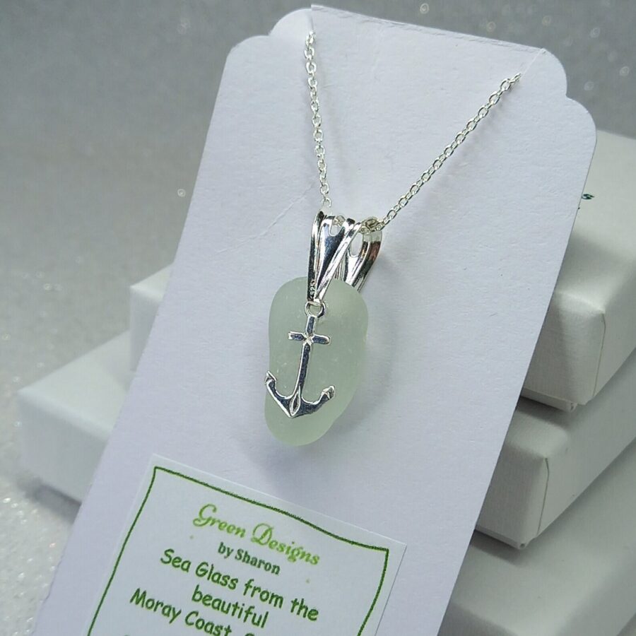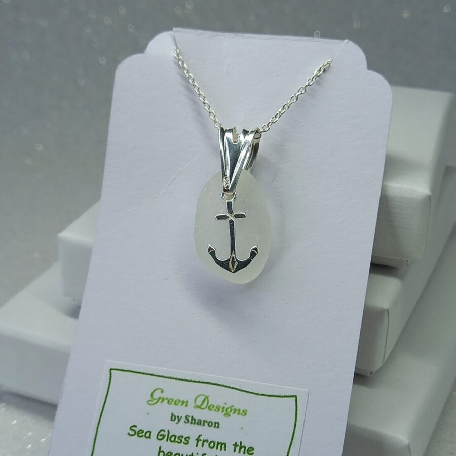 The maker carefully drills a small hole in the sea glass to attach to a sterling silver bail and sterling silver anchor charm. Each pendant is complemented by a sterling silver chain. Please note that the style of chain may vary from these photos.