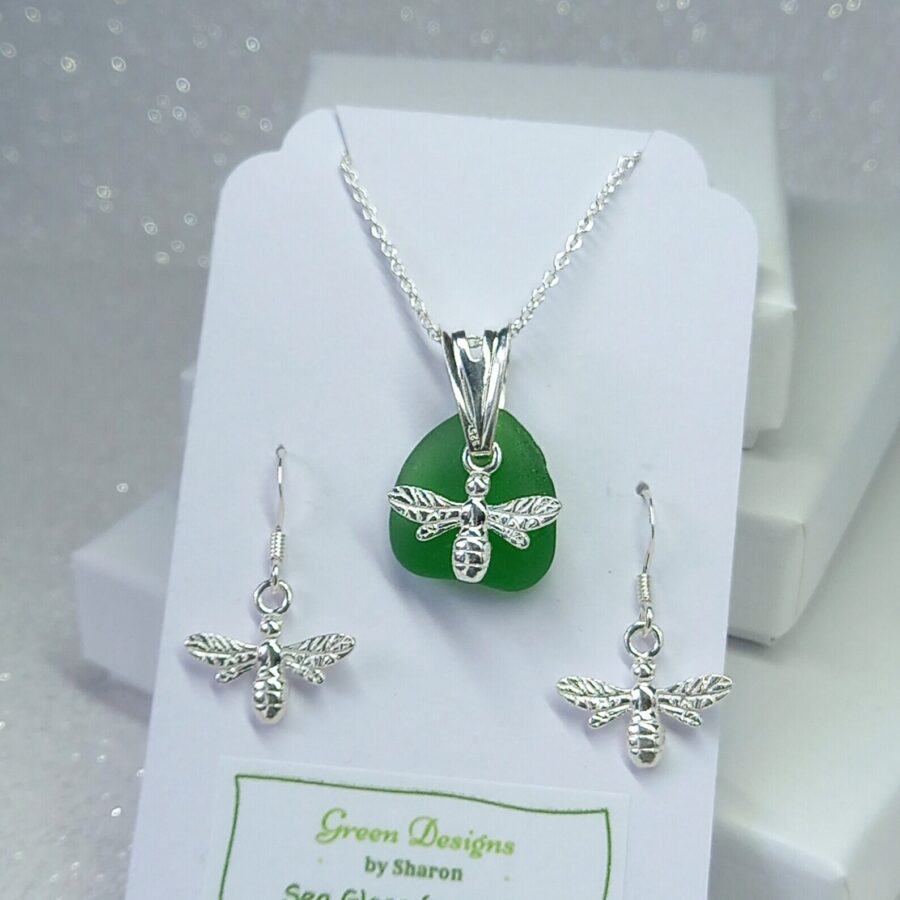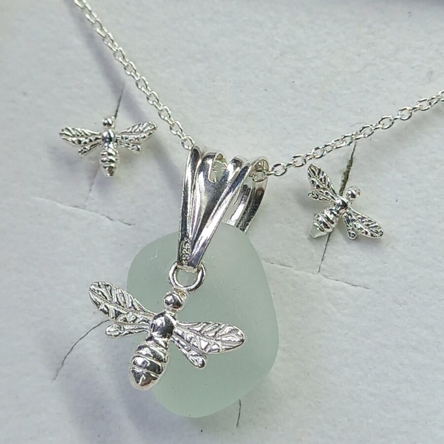 This jewellery set features a beautiful locally found piece of genuine sea glass in green, sea foam or white/clear paired with a bee charm and matching earrings (studs or dangly). Please see variations in colour photo.