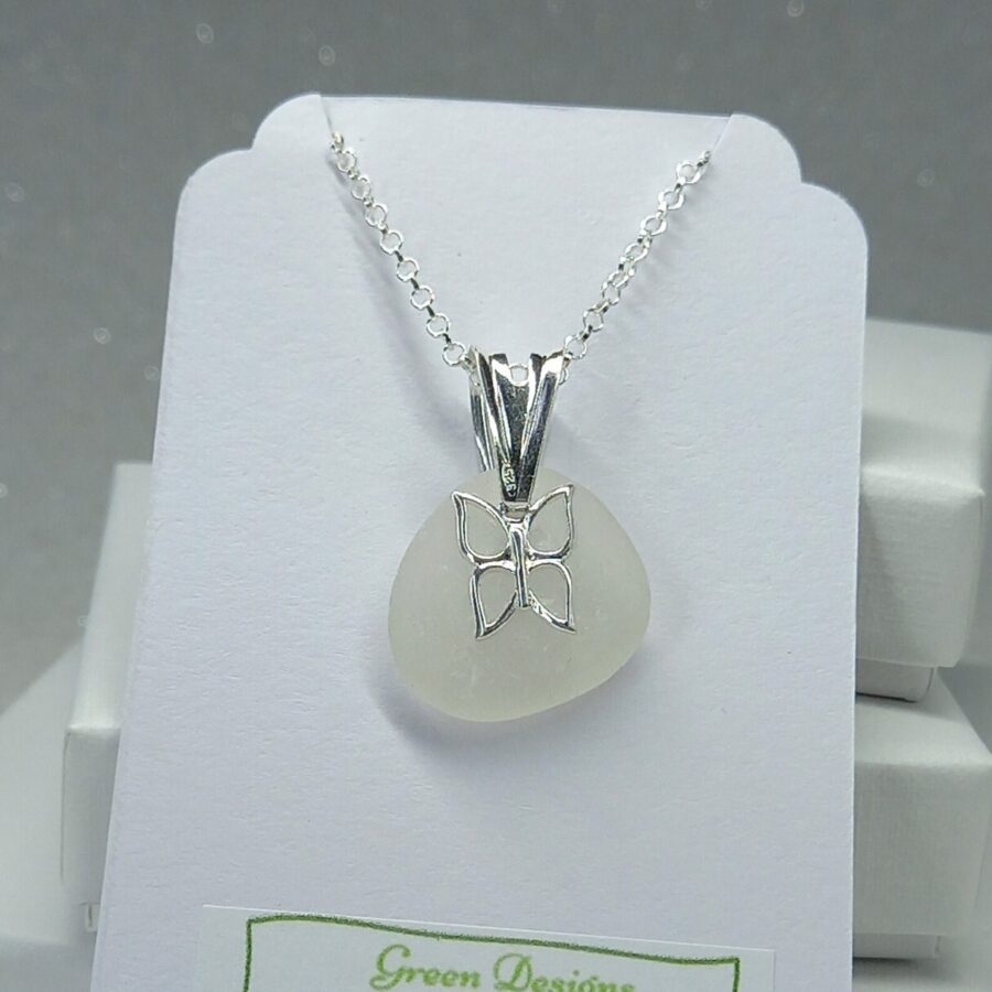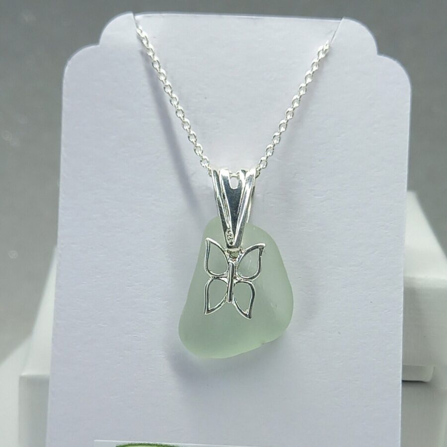 The maker carefully drills a small hole in the sea glass to attach to a sterling silver bail and sterling silver butterfly charm. Each pendant is complemented by a sterling silver chain. Please note that the style of chain may vary from these photos.