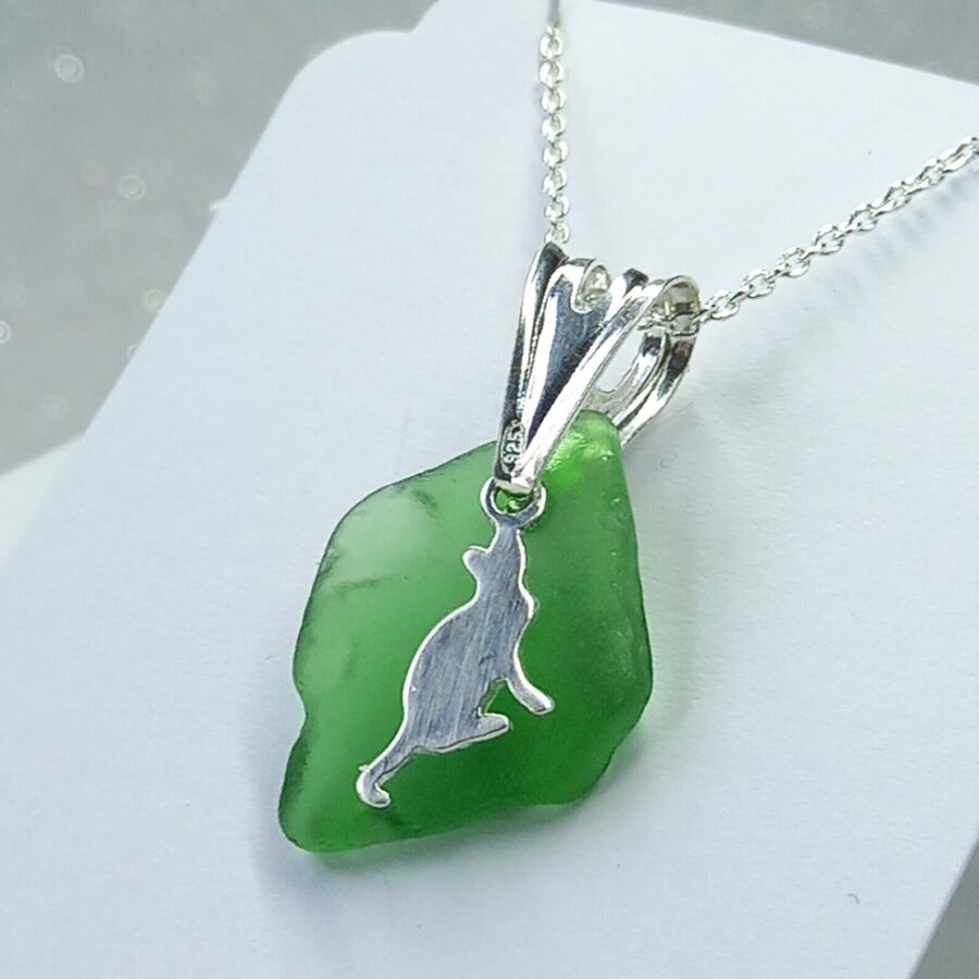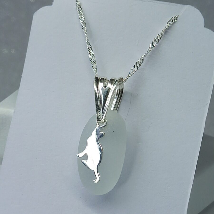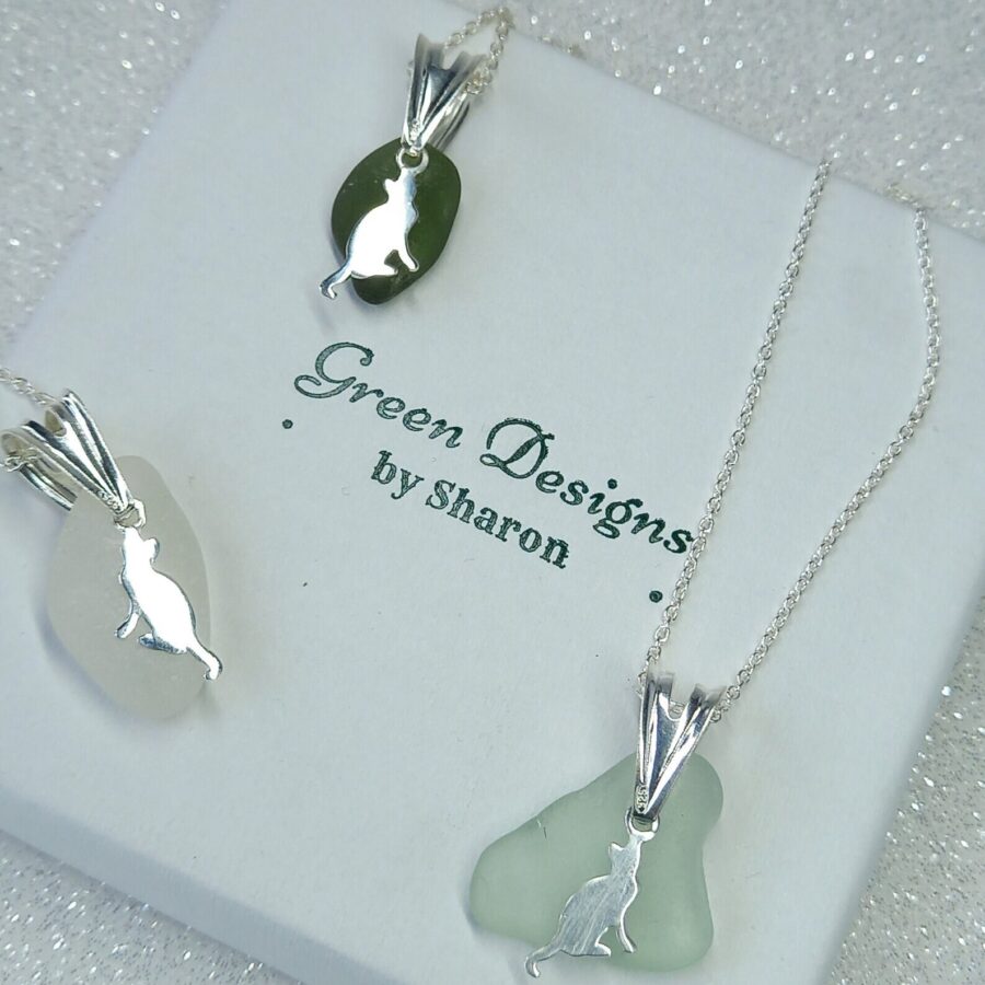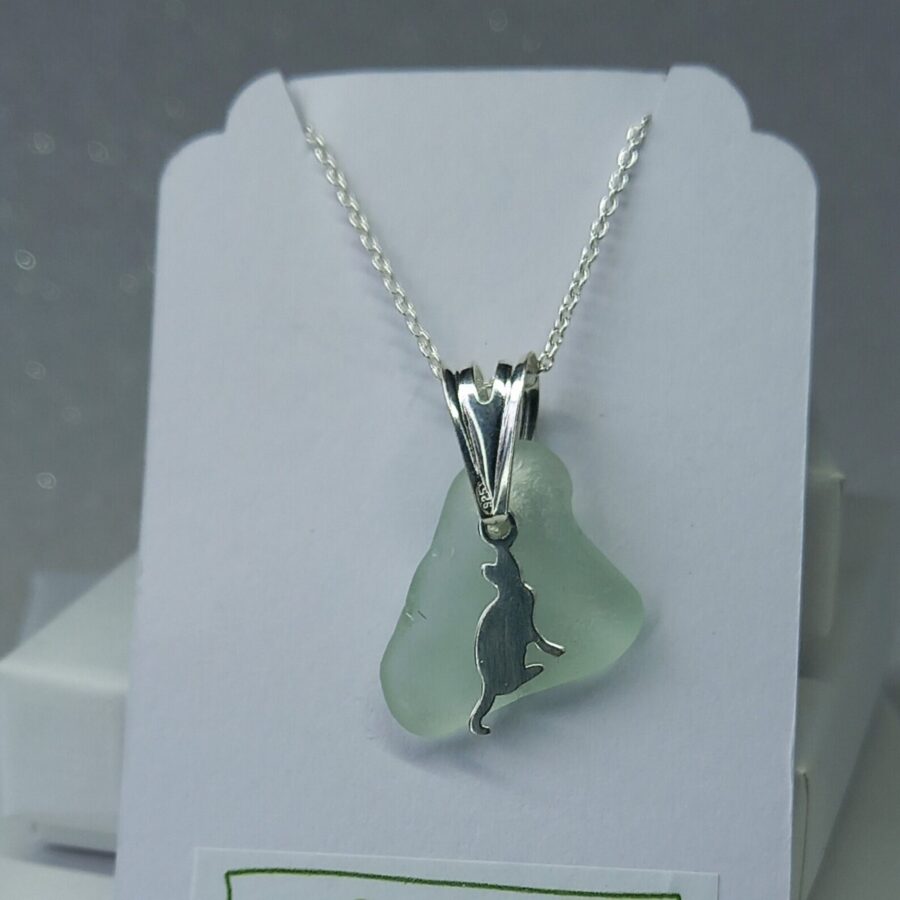 This necklace features a beautiful locally found piece of genuine sea glass in green, seafoam or clear (select using the drop down menu). The artist has carefully drilled a small hole in the sea glass to attach to a sterling silver jump ring before adding a beautiful sterling silver cat charm. Each pendant is complemented by a delicate sterling silver chain.