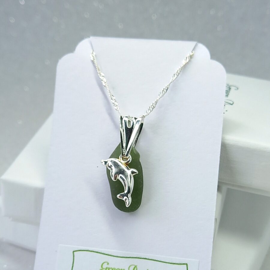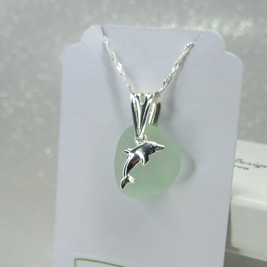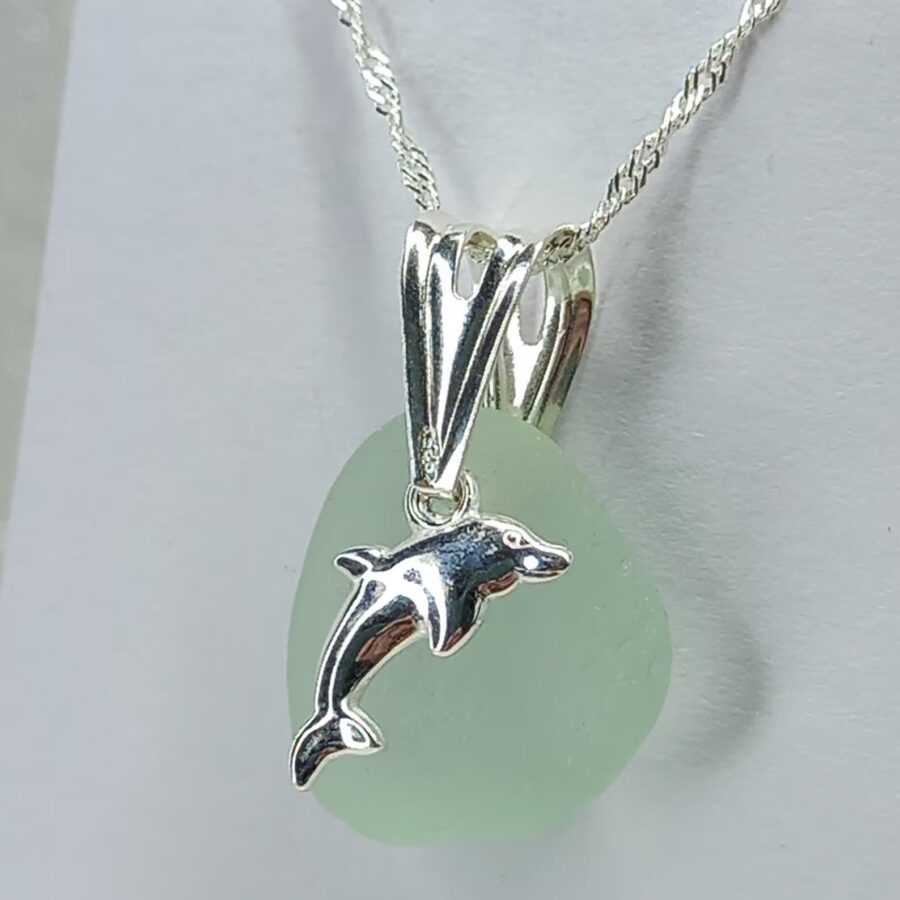 This necklace features a beautiful locally found piece of genuine sea glass in green, seafoam or clear (select using the drop down menu). The artist has carefully drilled a small hole in the sea glass to attach to a sterling silver jump ring before adding a beautiful sterling silver dolphin charm. Each pendant is complemented by a delicate sterling silver chain.