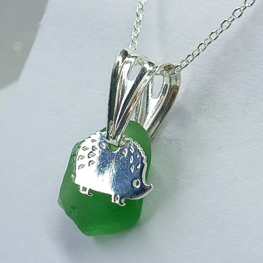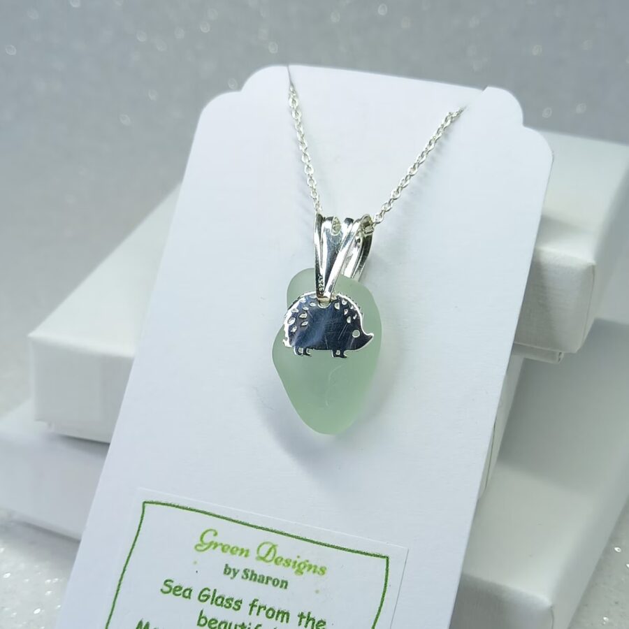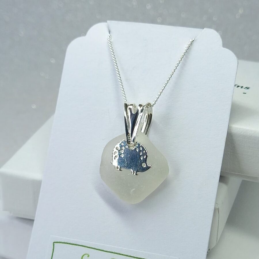 This necklace features a beautiful locally found piece of genuine sea glass in green, seafoam or clear (select using the drop down menu). The artist has carefully drilled a small hole in the sea glass to attach to a sterling silver jump ring before adding a beautiful sterling silver hedgehog charm. Each pendant is complemented by a delicate sterling silver chain.