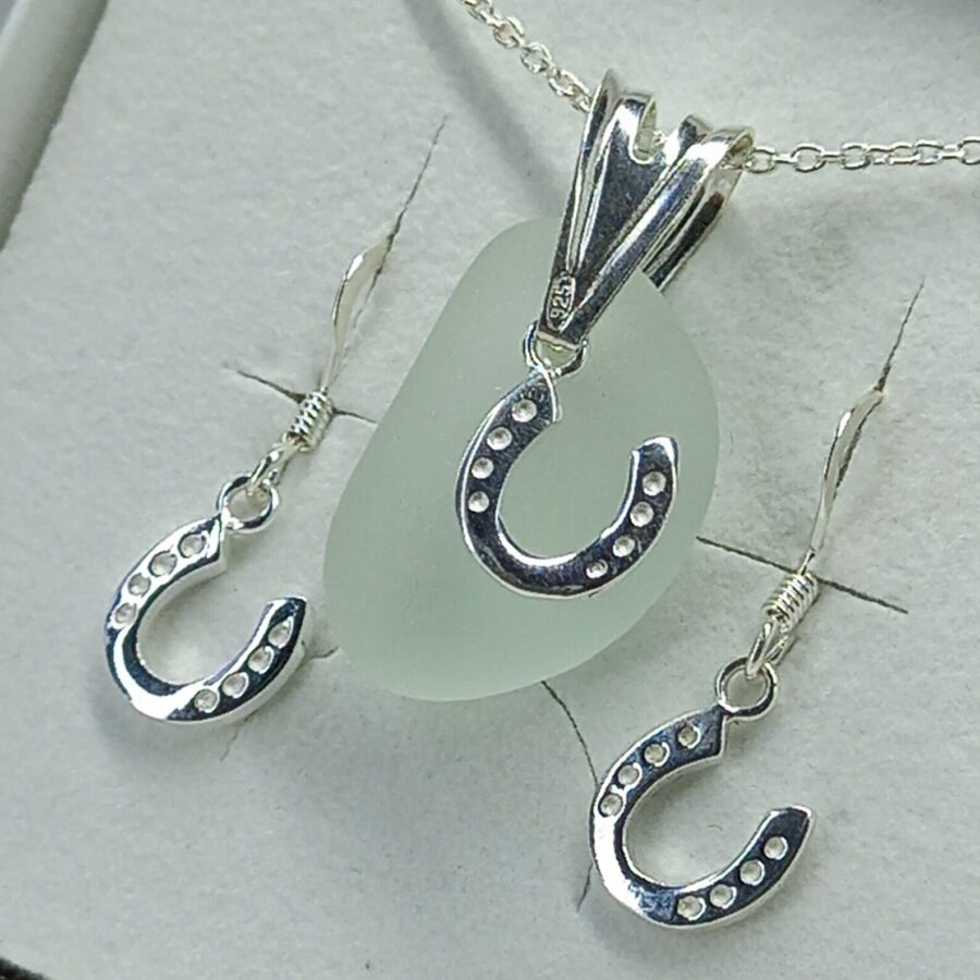 This jewellery set features a beautiful locally found piece of genuine sea glass in green, sea foam or white/clear paired with a horse shoe charm and matching earrings. Please see variations in colour photo.