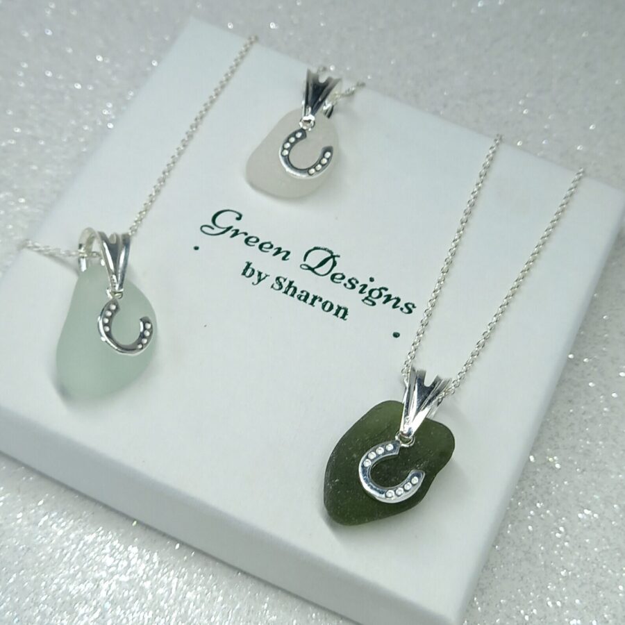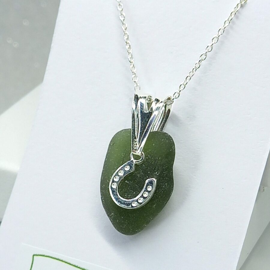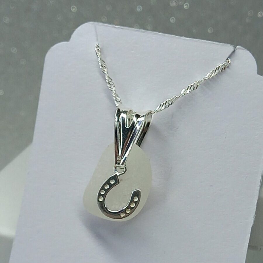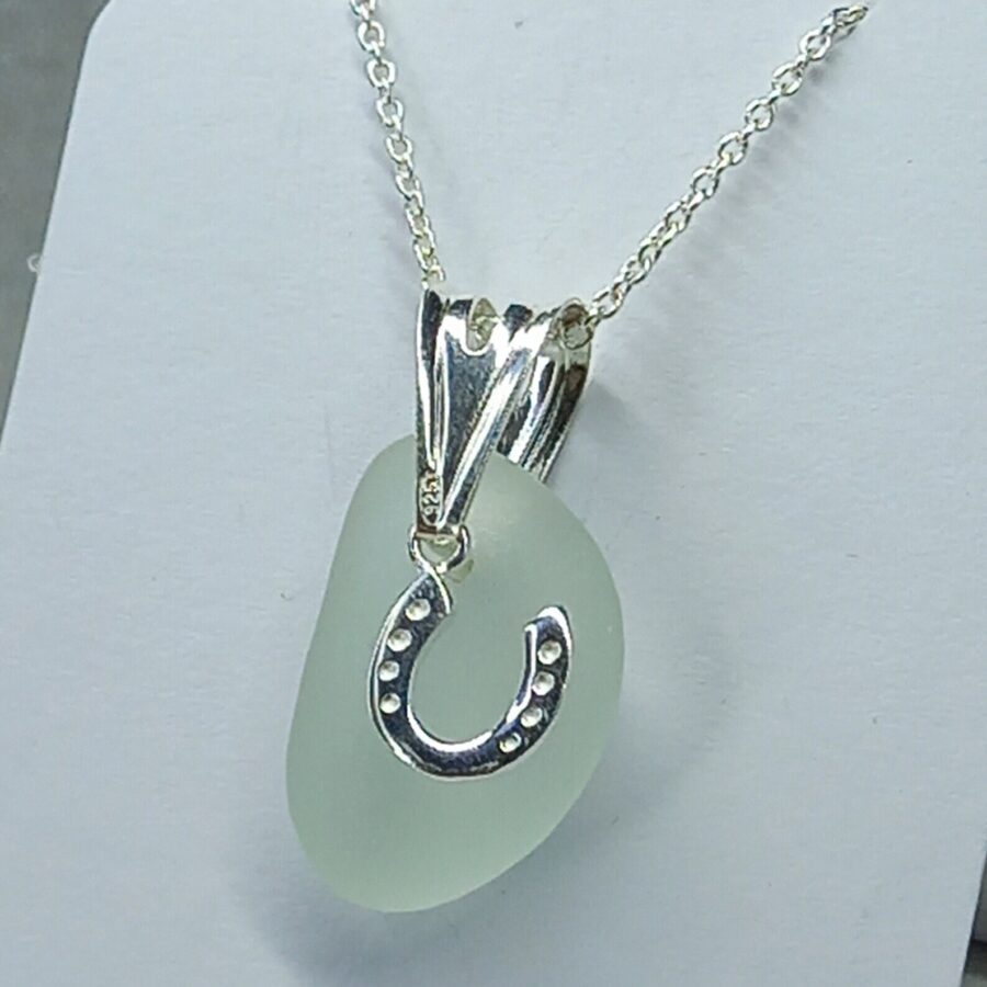 This necklace features a beautiful locally found piece of genuine sea glass in green, clear or seafoam (select using the drop down menu). The artist has carefully drilled a small hole in the sea glass to attach to a sterling silver jump ring before adding a beautiful sterling silver horseshoe charm. Each pendant is complemented by a delicate sterling silver chain.