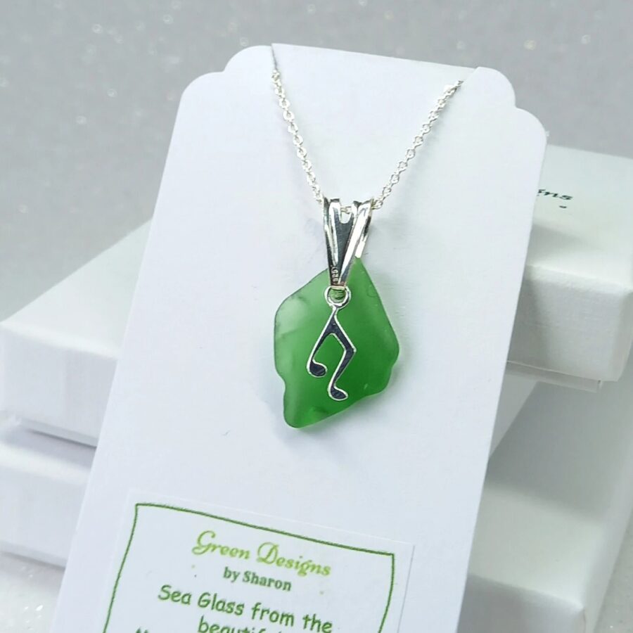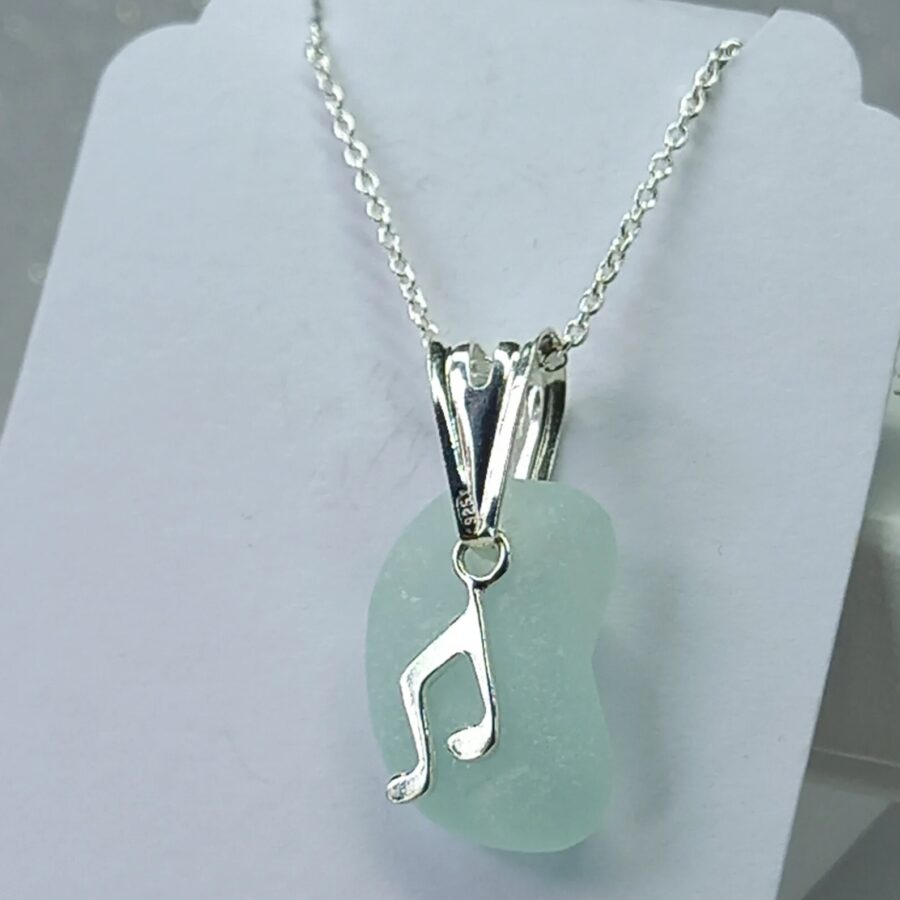 This necklace features a beautiful locally found piece of genuine sea glass in green, seafoam or clear (select using the drop down menu). The artist has carefully drilled a small hole in the sea glass to attach to a sterling silver jump ring before adding a beautiful sterling silver music note charm. Each pendant is complemented by a delicate sterling silver chain.