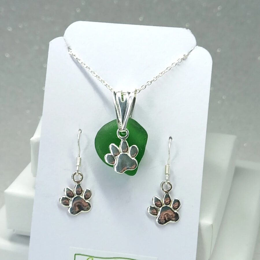 This jewellery set features a beautiful locally found piece of genuine sea glass in green, sea foam or white/clear paired with a paw charm and matching earrings. Please see variations in colour photo.