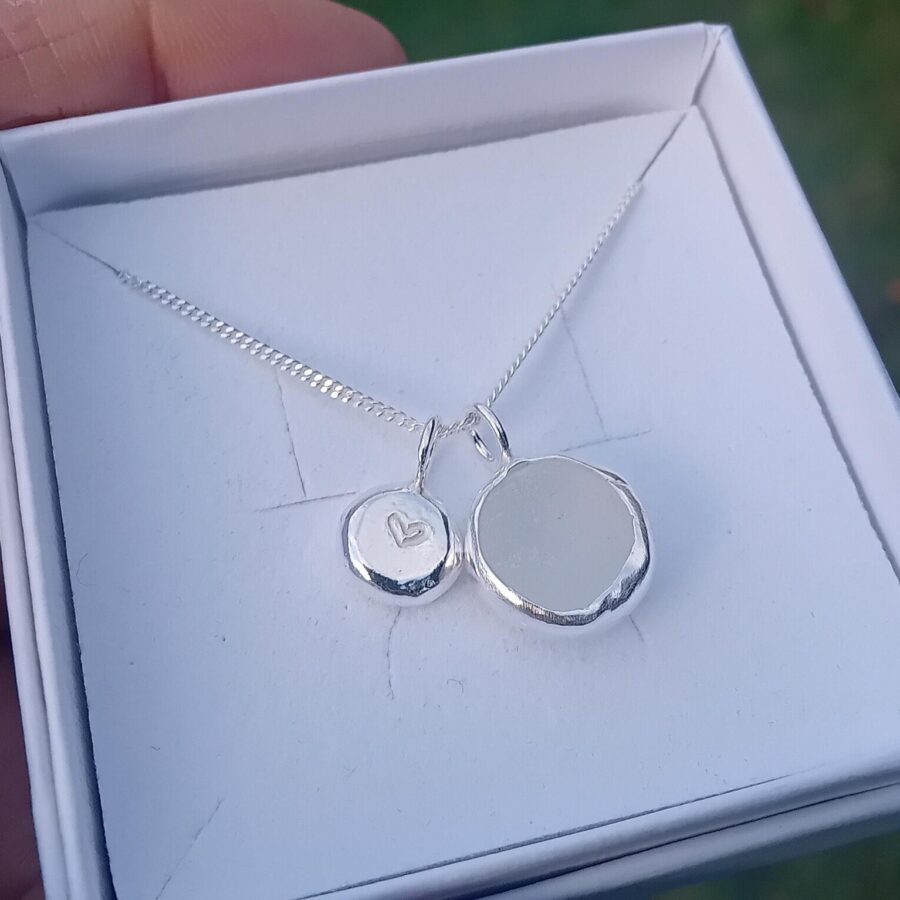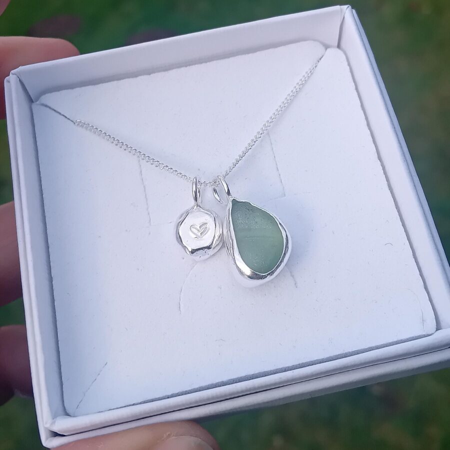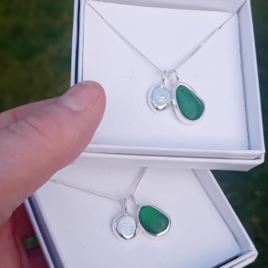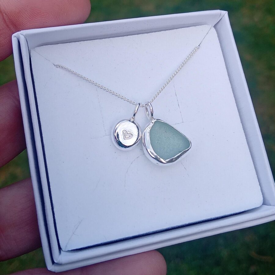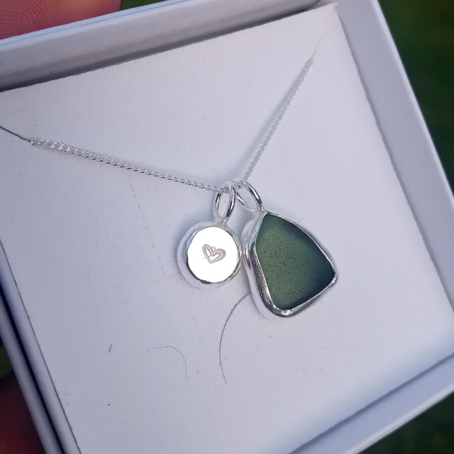 This beautiful necklace is made using locally found pieces of sea glass (available in Green, Seafoam or Clear) set in a sterling silver bezel setting with a handmade nugget made by melting sterling silver scrap into a ball, hammering into shape, adding a jump ring and finishing off with a simple heart stamp. Your sea glass measures between 1.5 - 2 cm and your recycled sterling silver nugget is approx 1 cm. Each pendant is complimented by an 18" sterling silver chain.