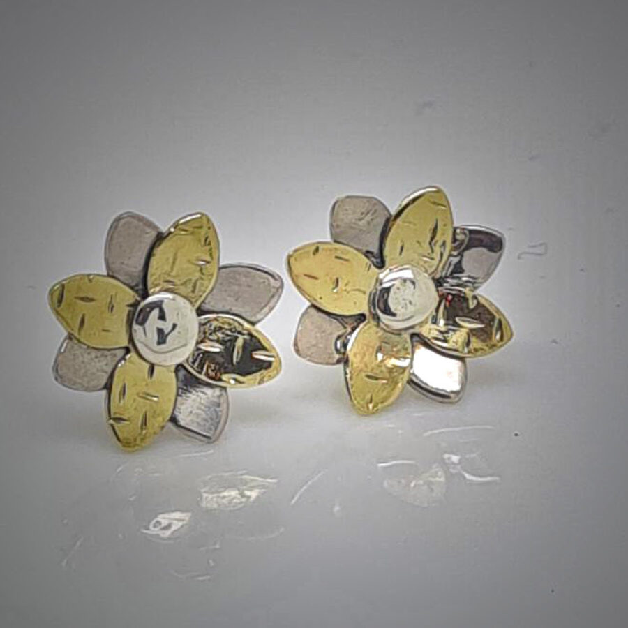 A pair of pretty sterling silver star flower earrings with textured brass detail. All items are gift boxed with recyclable packaging.