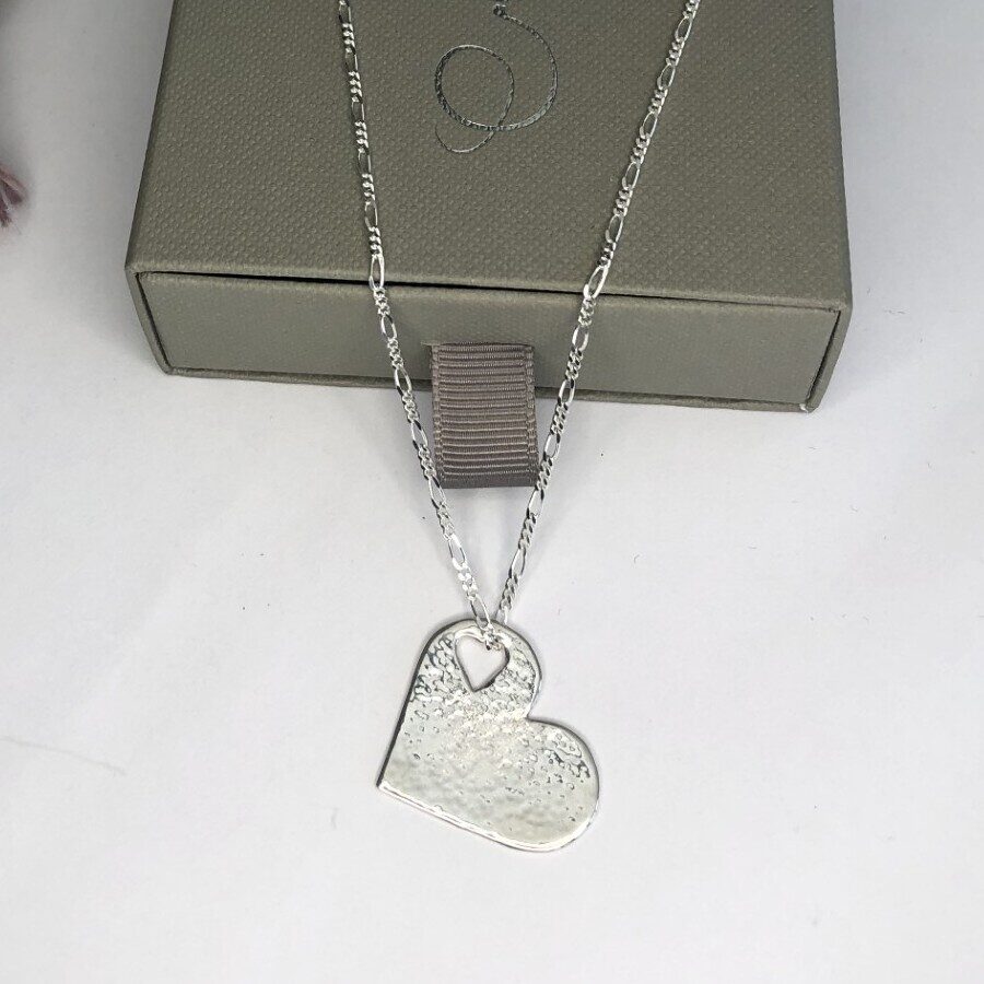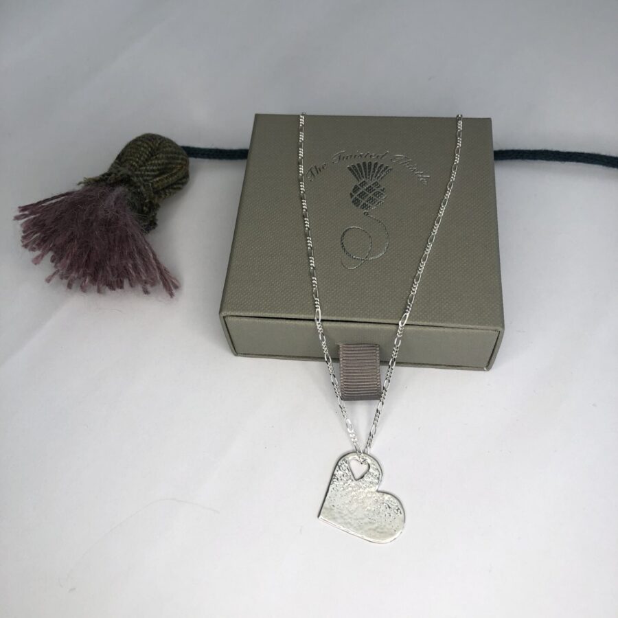 This beautiful necklace is hand made and designed by Lorraine of Twisted Thistles. The piece consists of solid silver textured heart with cut out heart.