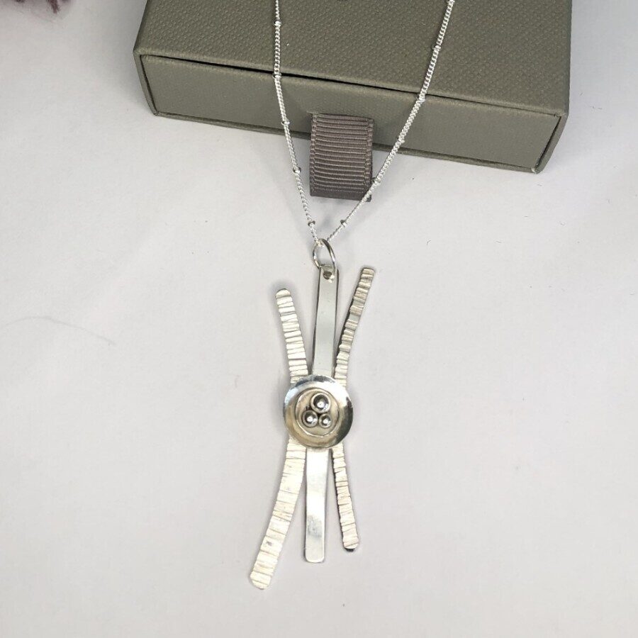 This beautiful necklace is hand made and designed by Lorraine of Twisted Thistles. This artisan piece consists of solid silver textured and plain curves and discs.