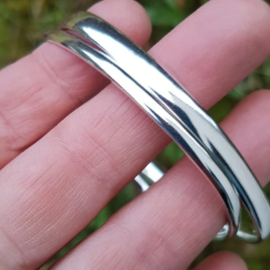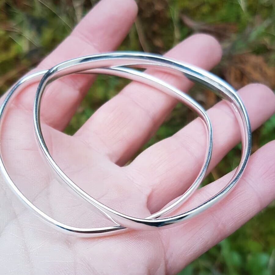 These beautiful bangles are made from solid sterling silver, they have a highly polished finish and an oval profile. There are two sizes. The narrow bangle measures approx 3.5 mm in width and 1.9 mm depth, an inside diameter of 65 mm. The wide bangle measures 5.4 mm in width, 2.3mm depth with a 66mm inside diameter. Hallmarked by the Birmingham assay office. It comes gift boxed and sent via Royal Mail special delivery.