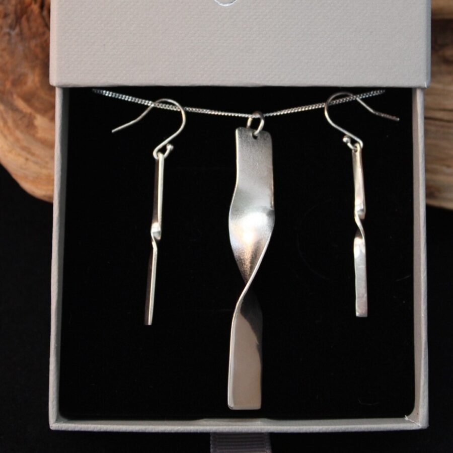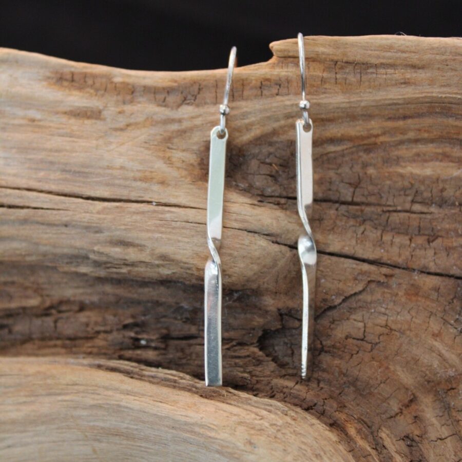 These earrings are hand made and designed by Lorraine of Twisted Thistles. The sterling silver drop earrings feature a twist mid way down.