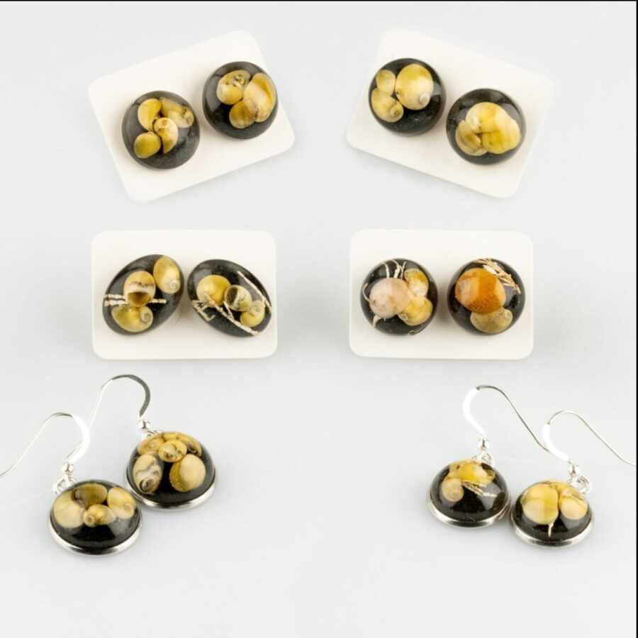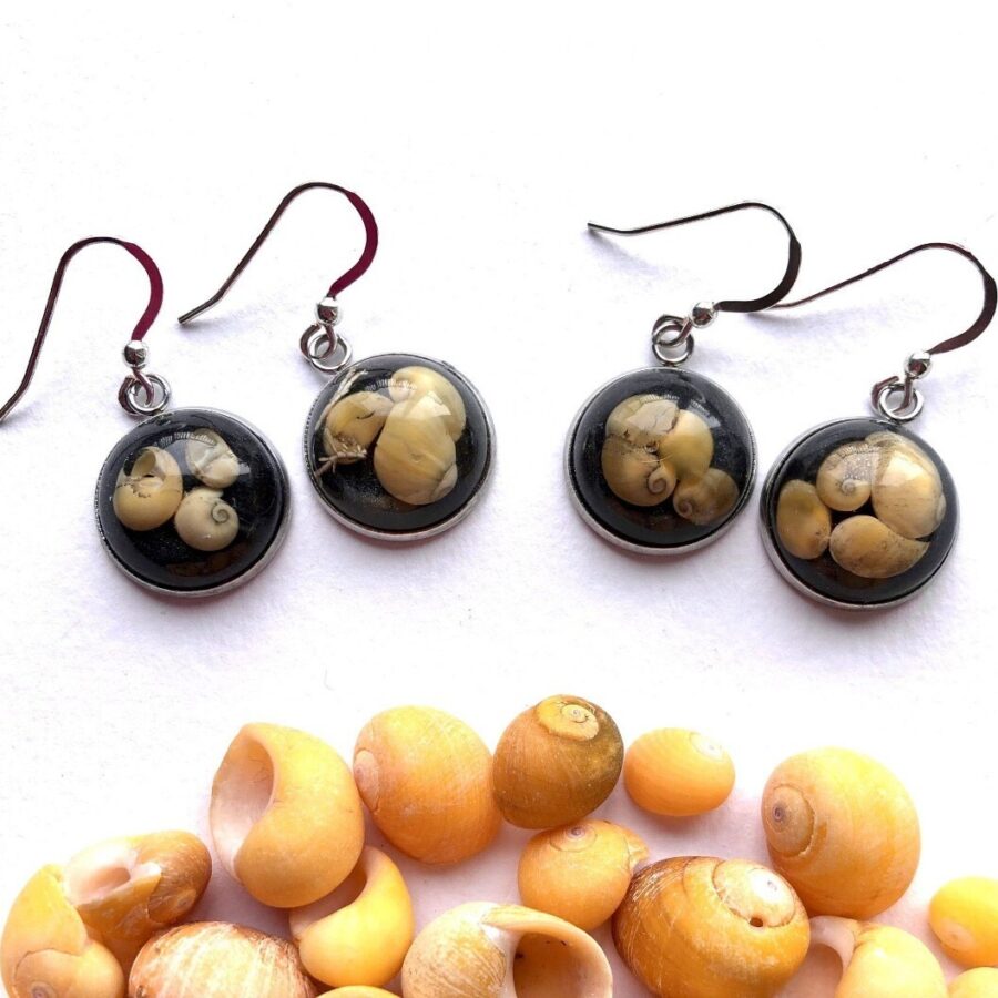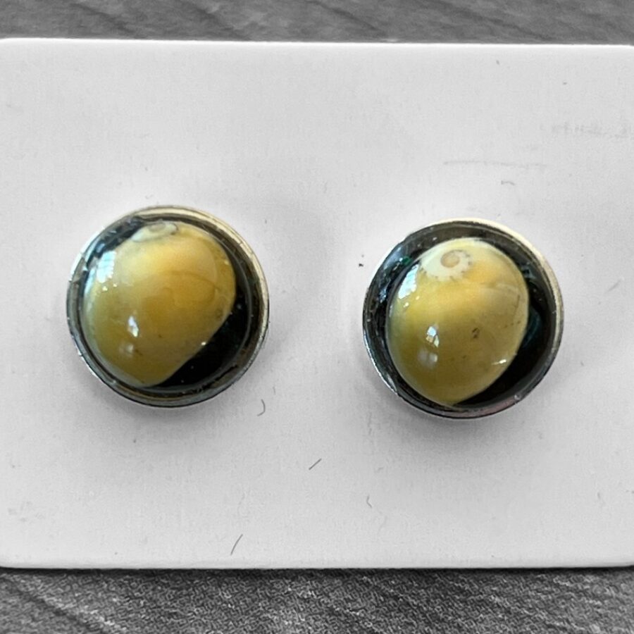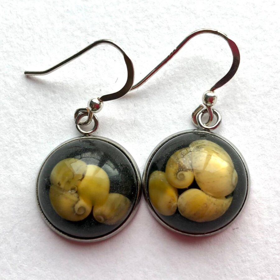 Special mini yellow and orange periwinkle shells have been collected from the island of Whalsay to make these earrings. The shells have been set into crystal clear resin and finished with a shimmering black background. The stud post and butterfly back is hallmarked sterling silver, as is the ear hook. They come in a gift box.