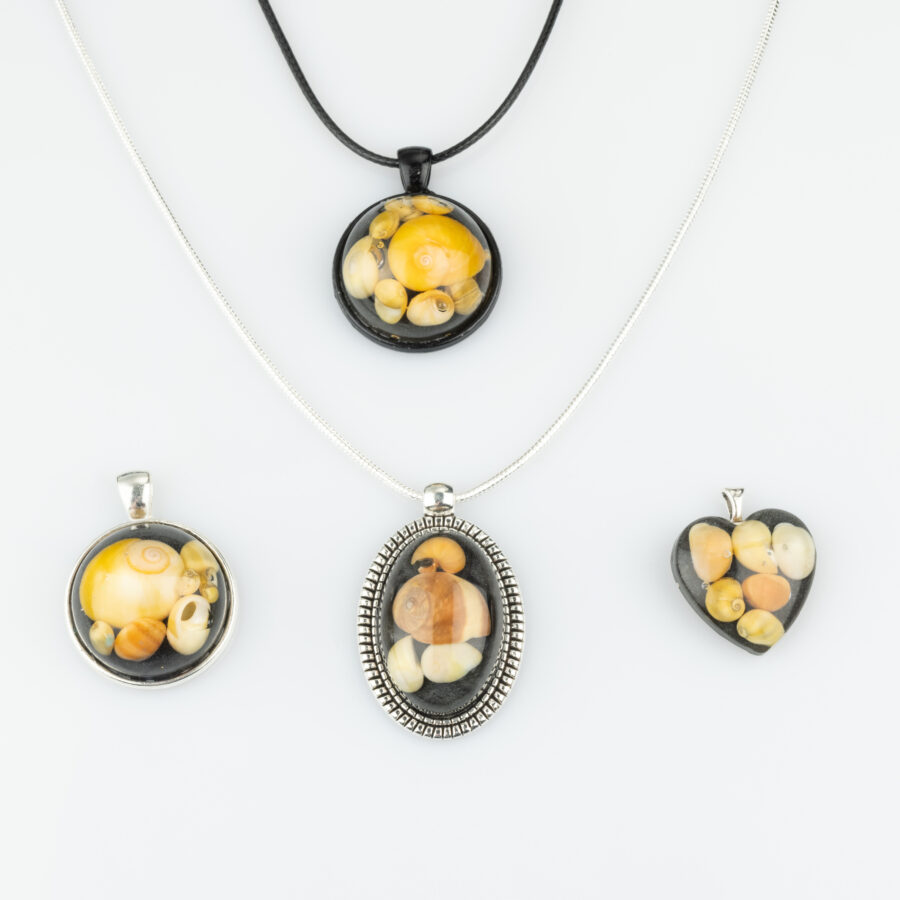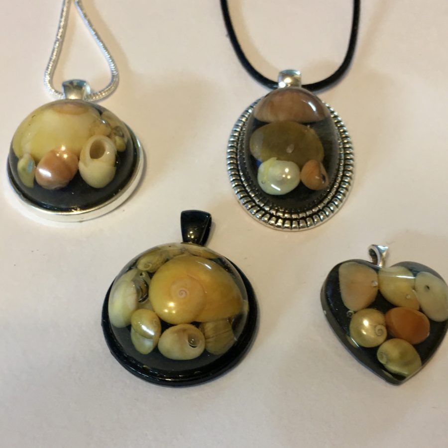 Special yellow and orange periwinkle shells, collected from the small island of Whalsay have been used to make these original pendants. The shells are set into crystal clear resin with a shimmering black background layer added. Choose your preferred shape and cord type using the dropdown and if choosing a sterling silver chain add your cord length in the comment box on ordering: