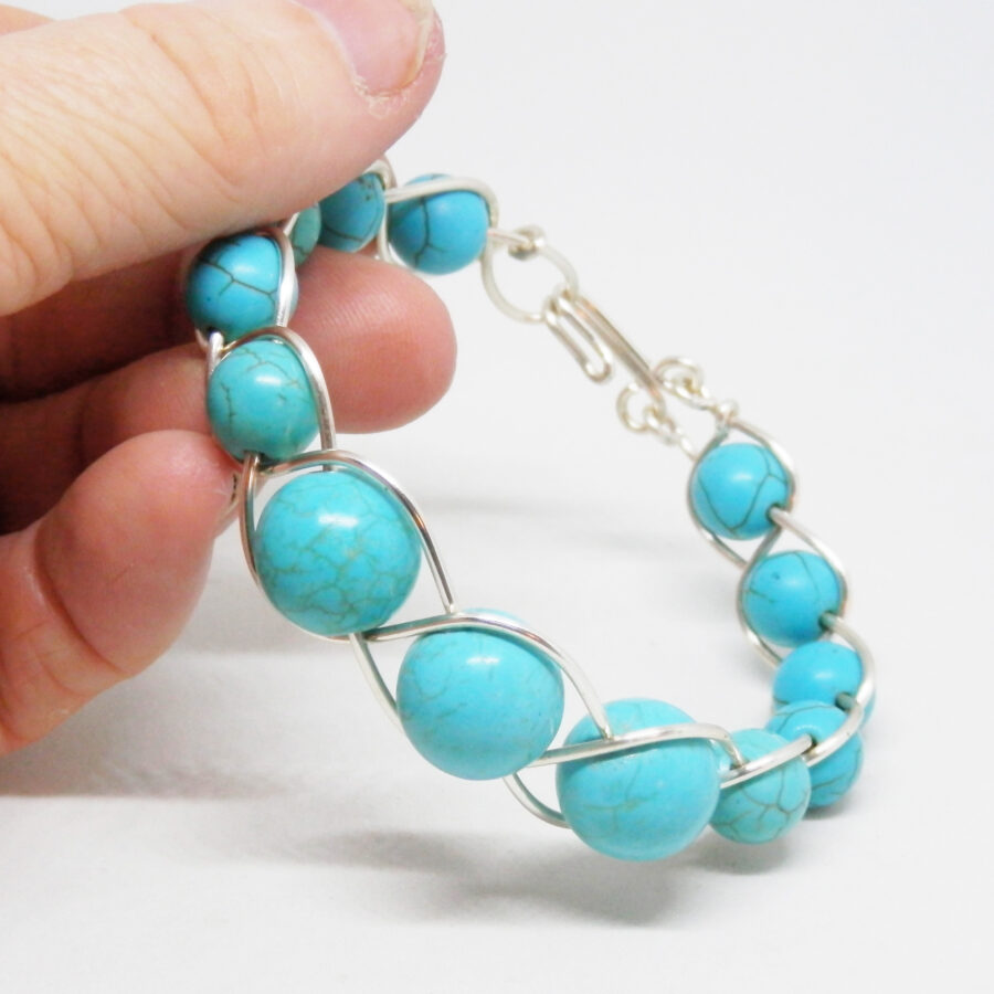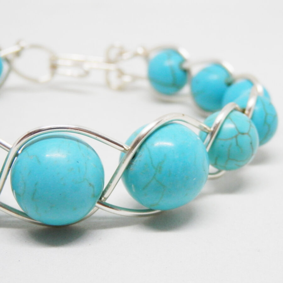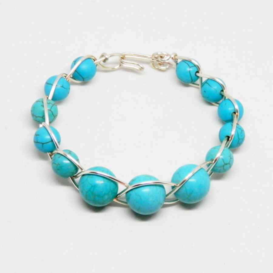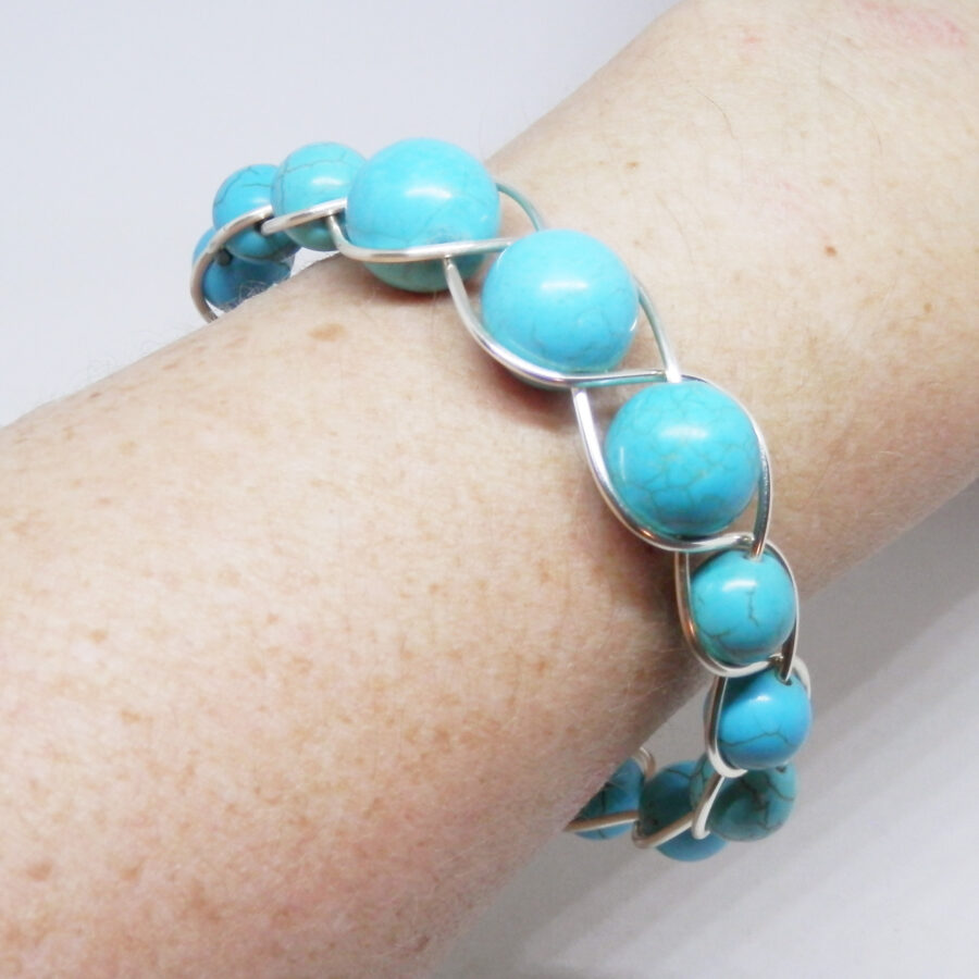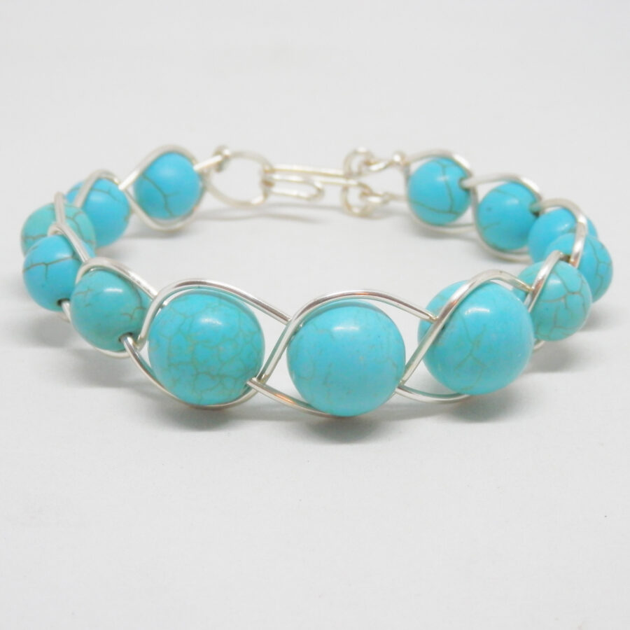 A beautiful handcrafted bracelet made with lots of 10mm and 14mm synthetic turquoise beads, threaded onto silver plated copper wire, and woven into a simple Celtic braid pattern. Would fit up to an 7.5 inch wrist maximum, and fastens with a hand made clasp. Comes to you in an organza bag. Lead and nickel free