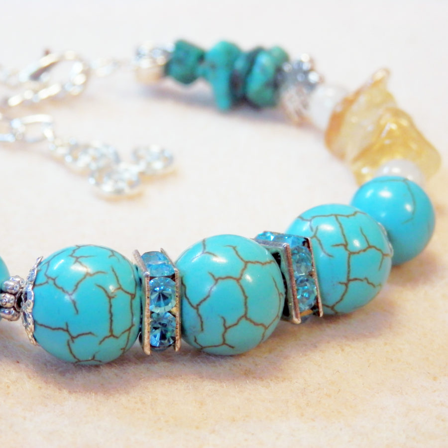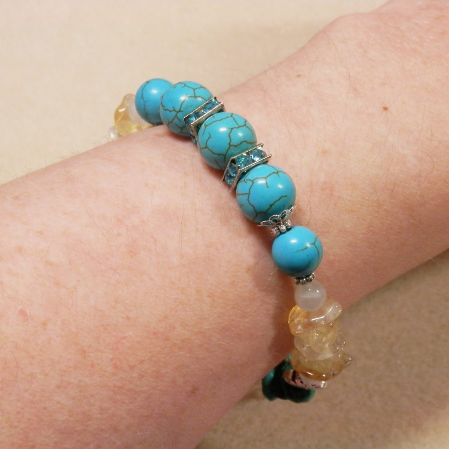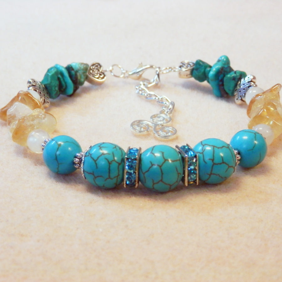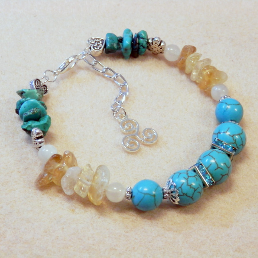 Beautiful hand made bracelet with synthetic turquoise beads and nuggets, citrine and moonstone gemstone beads, diamante spacers and metallic Celtic patterned beads. All assembled onto memory wire that retains its shape forever. This bracelet fastens with a lobster clasp and comes with an extension chain for the larger wrist. It would typically fit around 7.5 inch. Comes to you in a black gift box with padded insert. Lead and nickel free